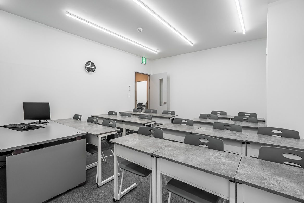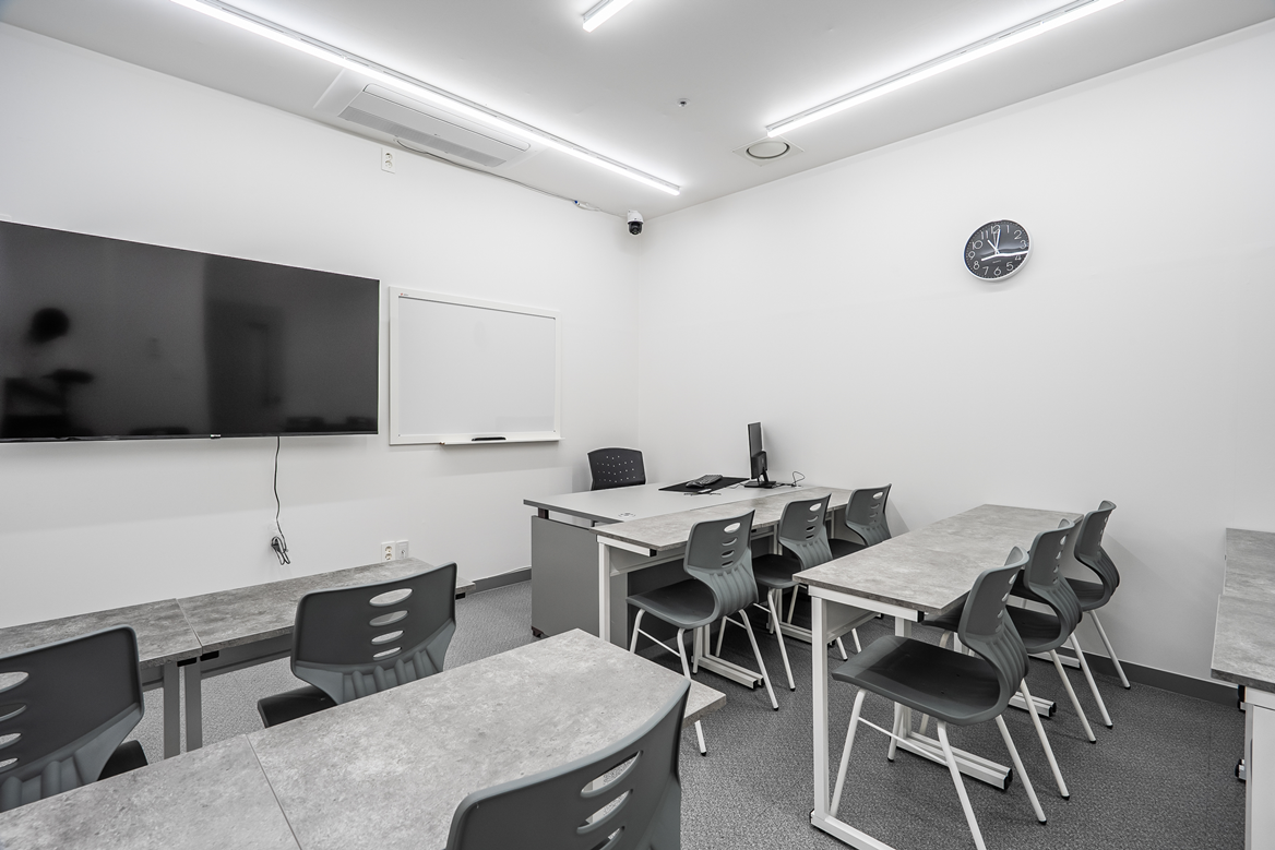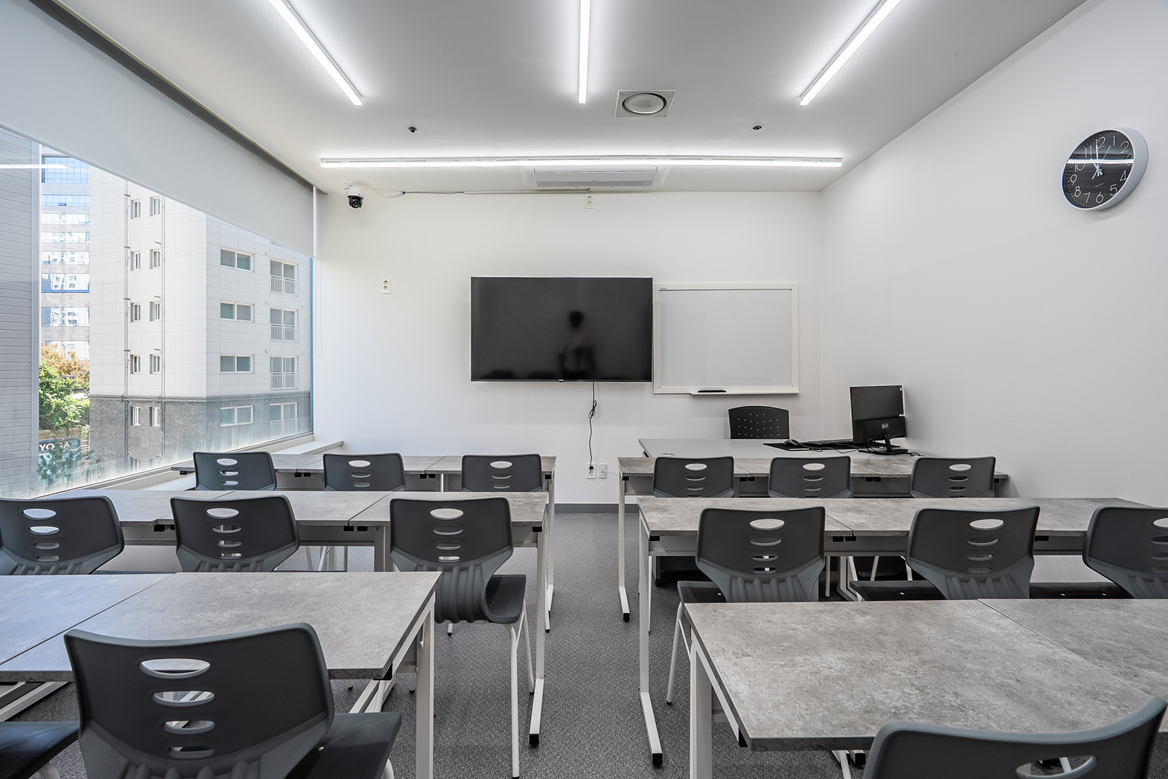 강의실은 전면에 스크린을설치하여 수업에 집중할 수 있도록 하였고,