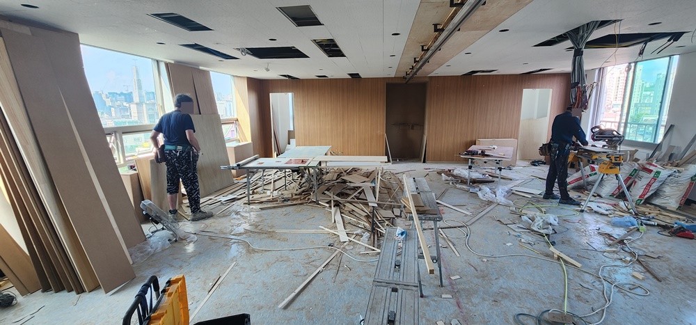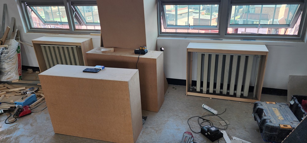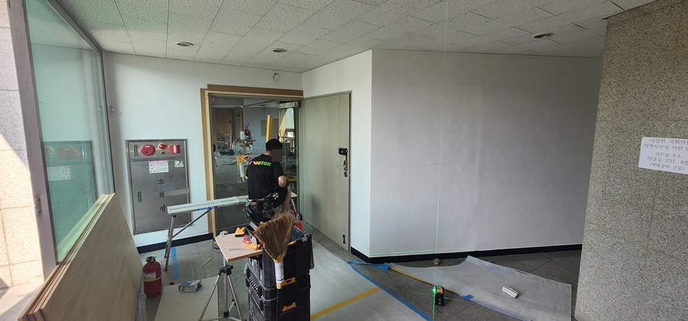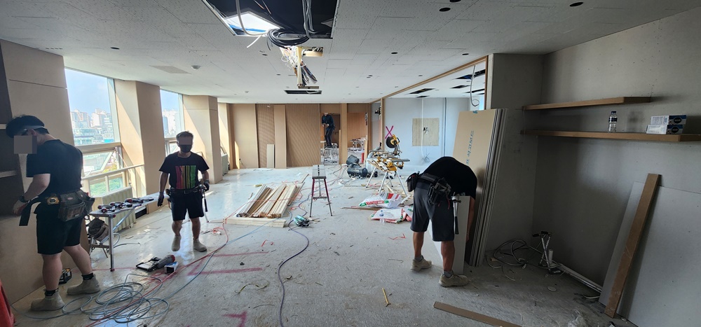 또한, 세련된 라운지 분위기를 조성하기 위해 하단부에 들어갈 간접 조명 박스를 미리 설치하고, 소음 차단과 냉난방 효율을 고려한 단열 및 가벽 공사를 병행했습니다.