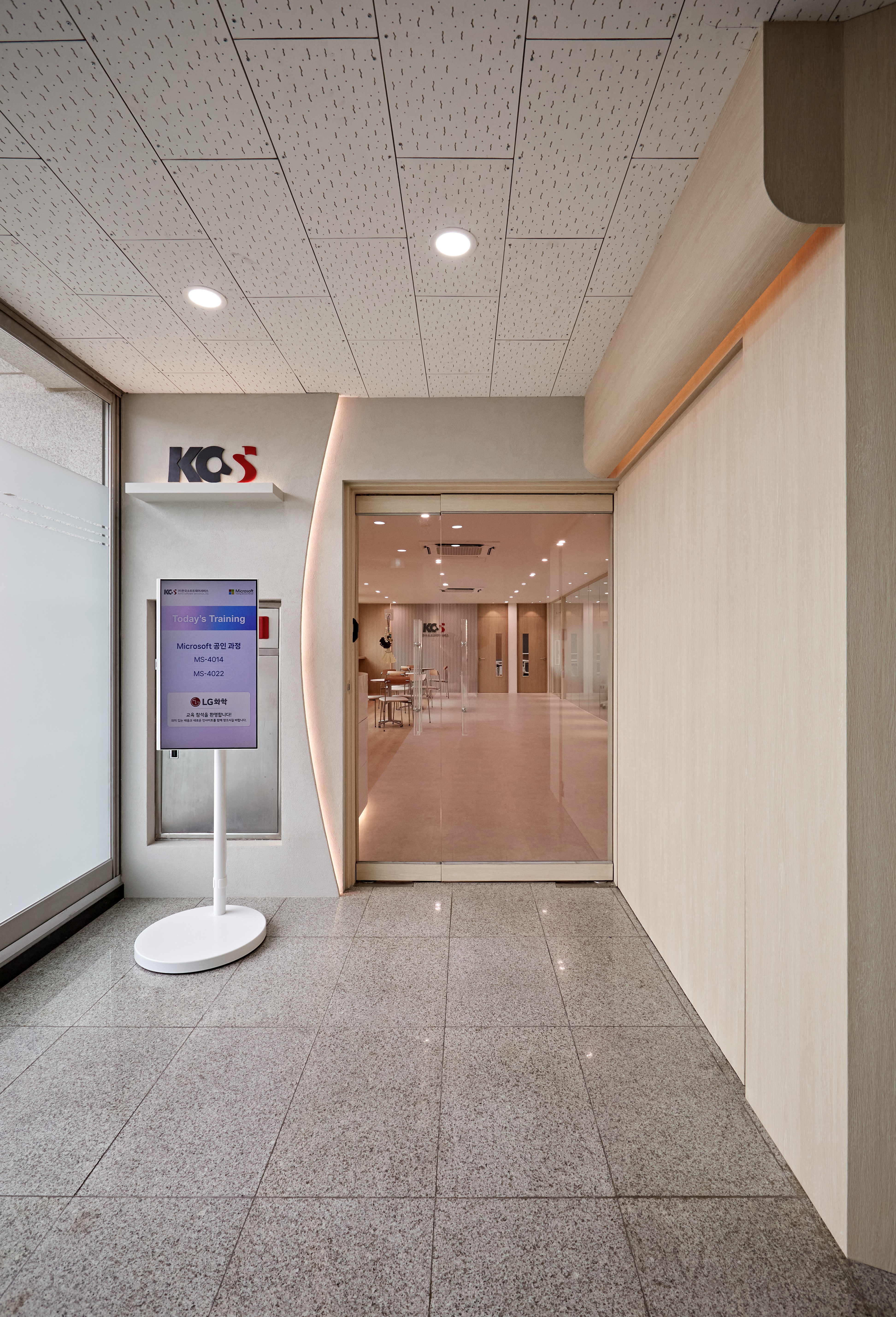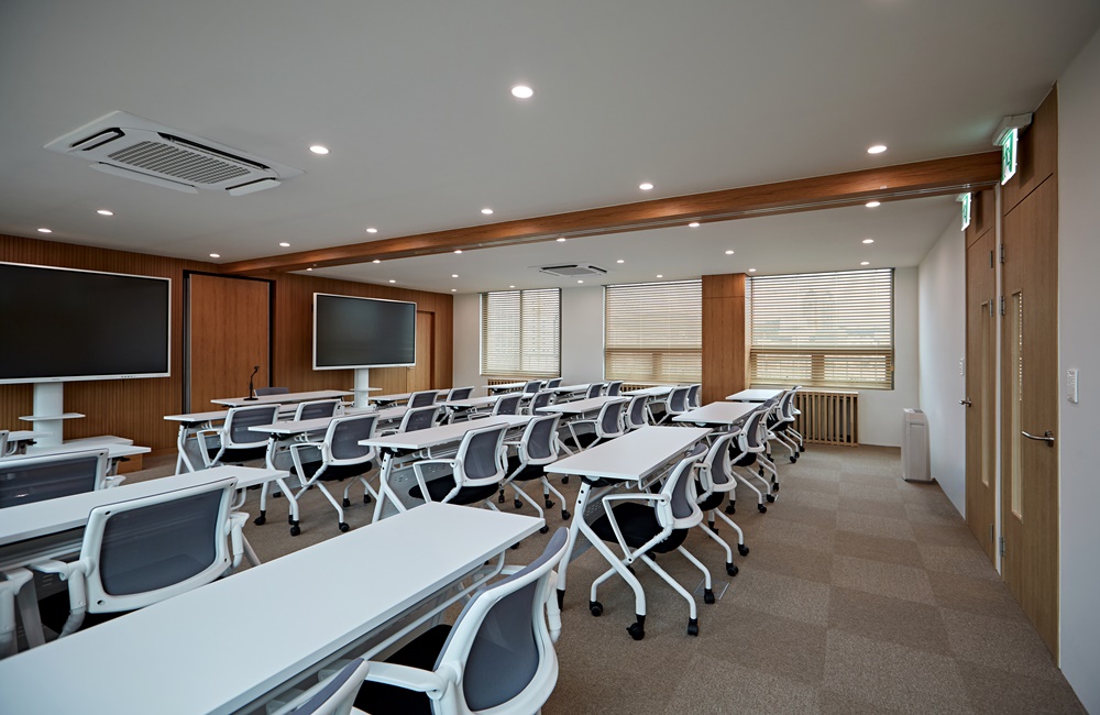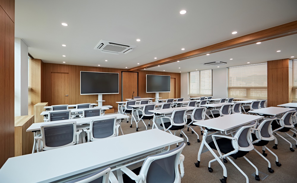 또한 대강의실이나 교육 공간은 많은 인원을 수용할 수 있도록 일직선 형태의 테이블 배치를 택했으며, 전면부에는 매립형 모니터를 설치해 IT 기업다운 스마트한 환경을 구축했습니다.