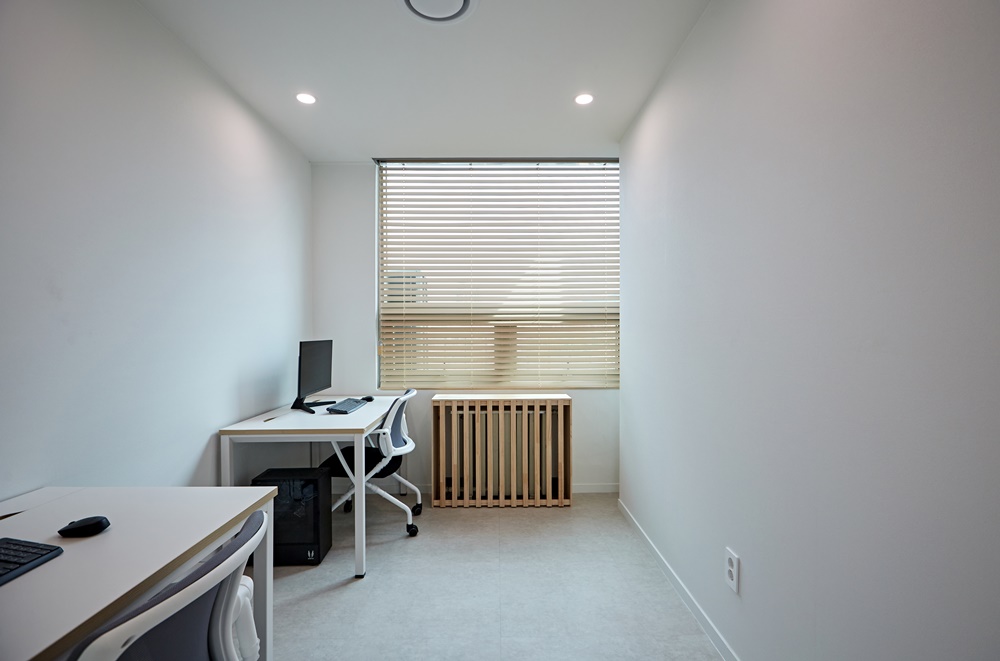 개별 업무실 내부 창가 블라인드와 라디에이터를 감싸는 우드 격자 프레임이 통일감 있게 배치되어 강남인테리어업체추천 사례다운 디테일한 마감 퀄리티를 확인하실 수 있습니다.