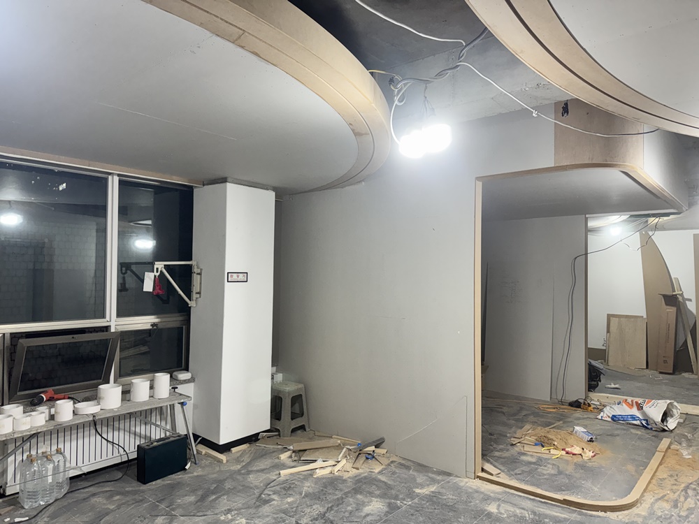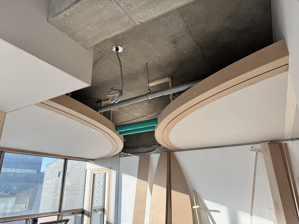이번 현장의 핵심인 곡선형 천장을 만들기 위해 목공 팀의 고난도 작업이 선행되었습니다.