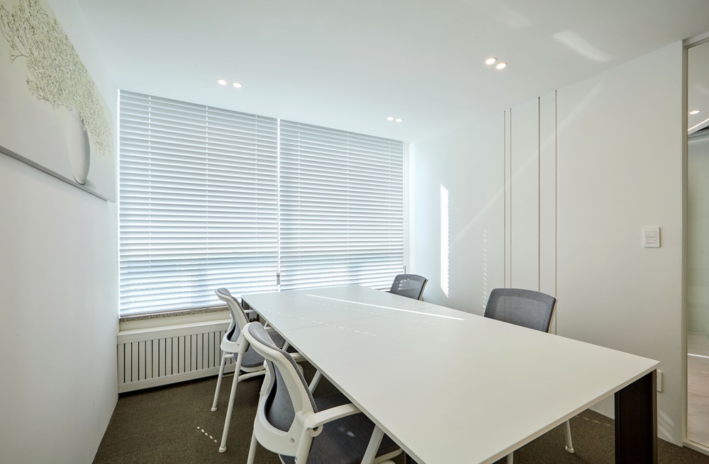 대형 창문에는 화이트 알루미늄 블라인드를 설치하여 외부 직사광선을 미세하게 조절할 수 있도록 했으며, 창가 쪽으로는 식물을 배치하여 자칫 삭막할 수 있는 오피스에 생동감 넘치는 플랜테리어 효과를 주었습니다.