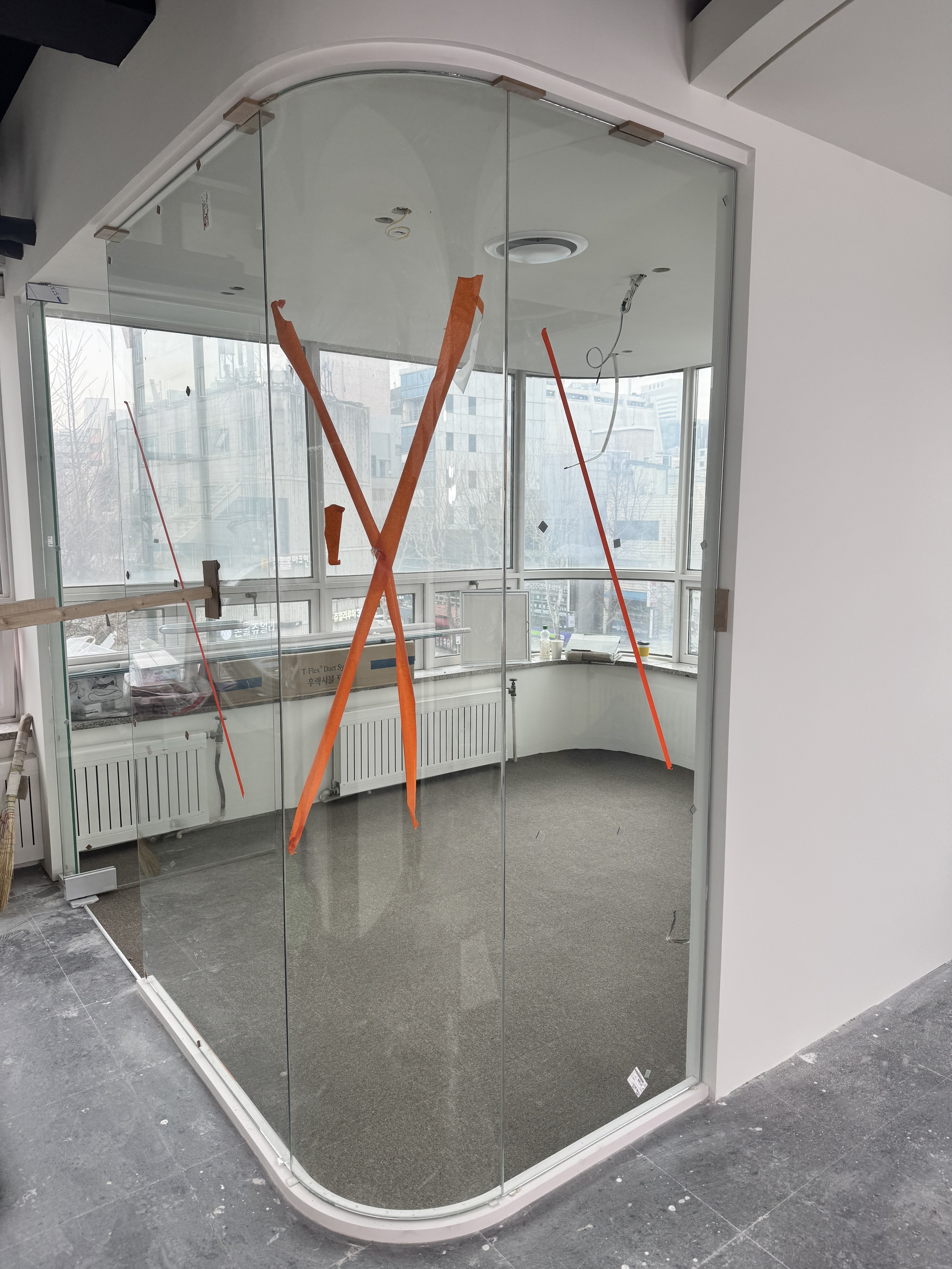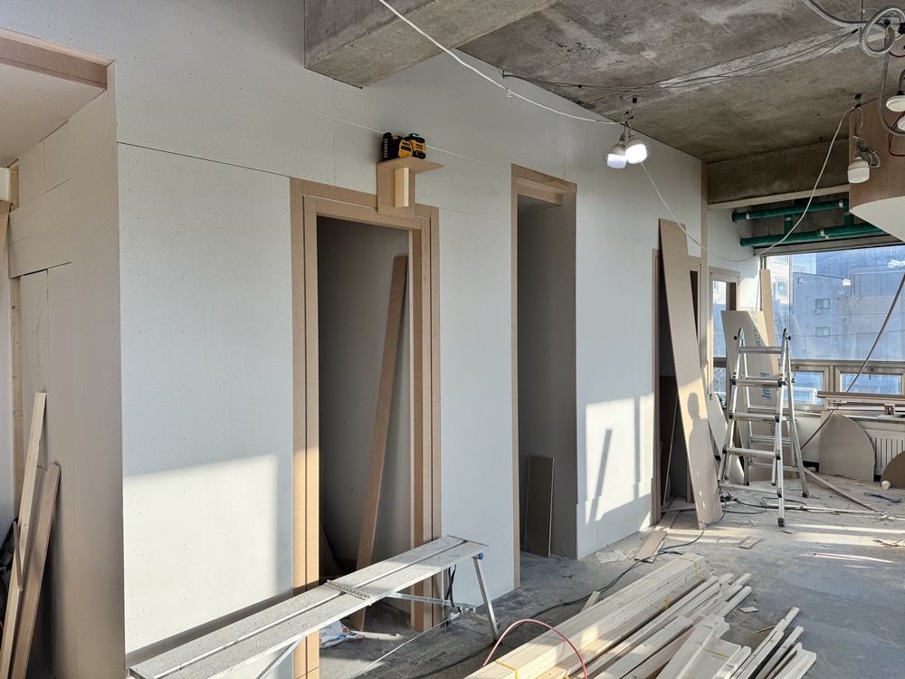 그리고 오피스의 개방감을 책임질 유리 가벽 공정에서는 수평과 수직의 완벽한 일치가 중요합니다.