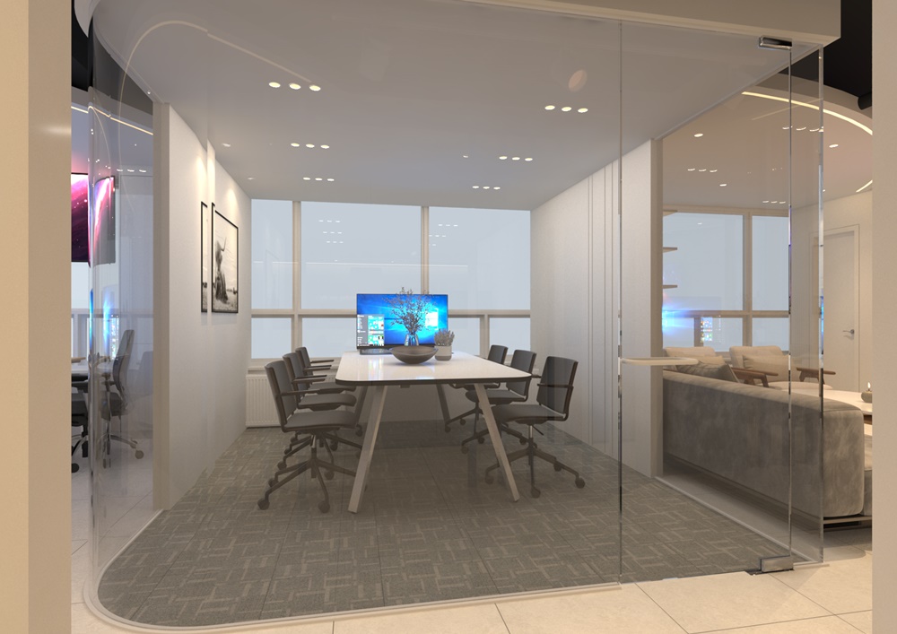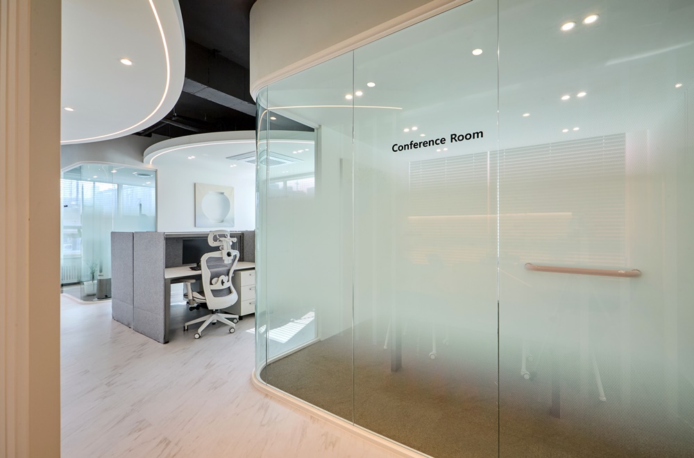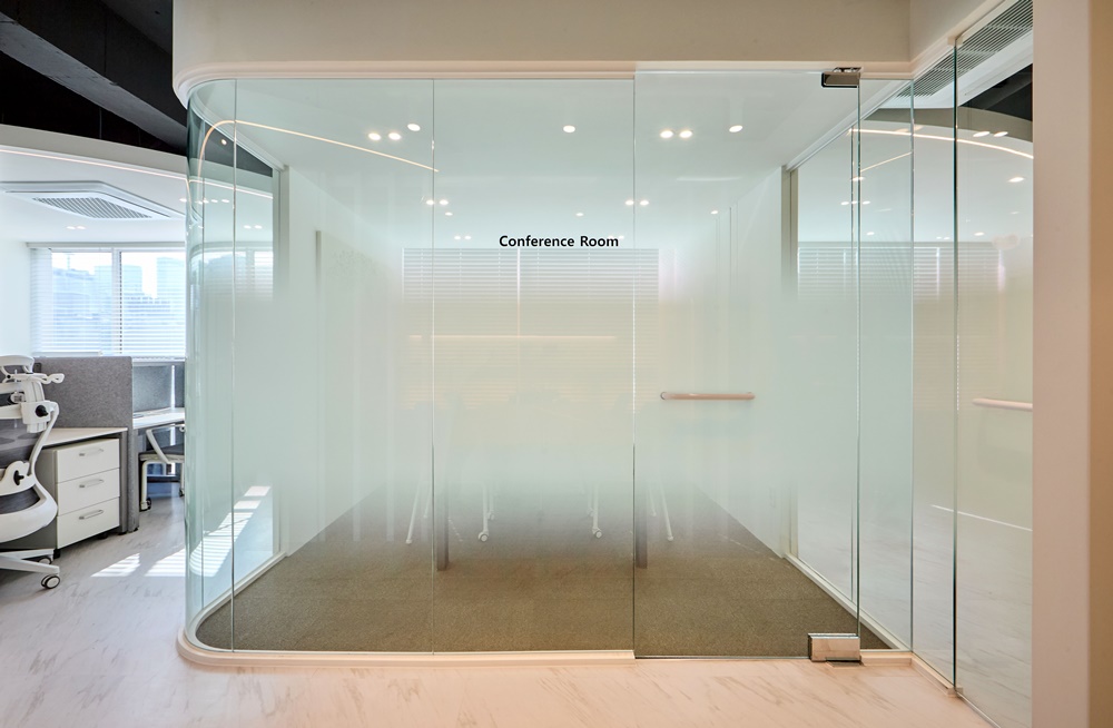 특히 컨퍼런스 룸의 곡면 유리는 제작 단계부터 정밀 실측을 통해 오차 없이 현장에 안착시켰으며, 도어 힌지 하나하나 하이엔드 하드웨어를 채택해 부드러운 개폐감을 확보했습니다.