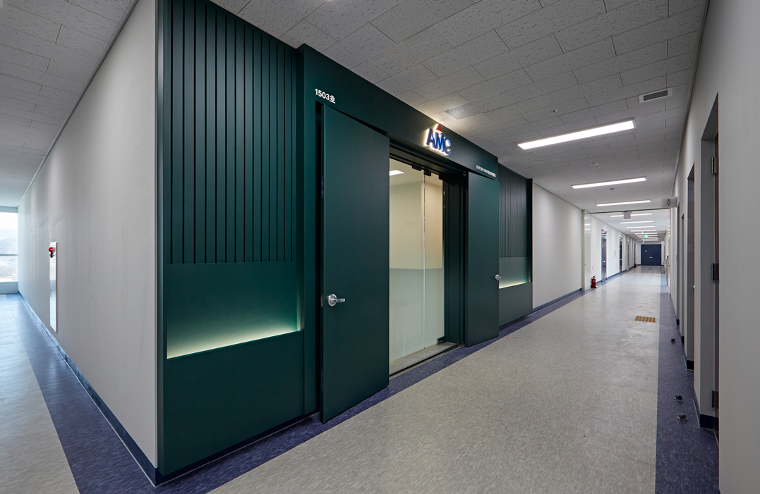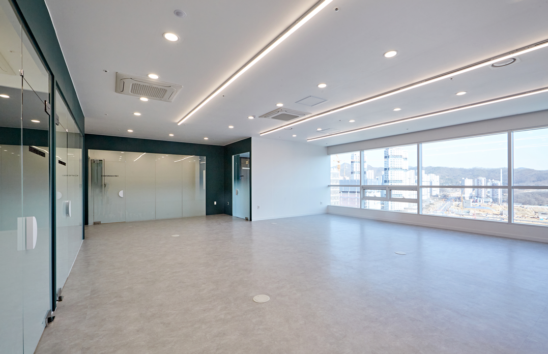곡선형 유리가벽 주변부는 매끄럽게 도장 마감해 유리와 벽체가 자연스럽게 이어지도록 세심한 마감이 진행되었습니다.
