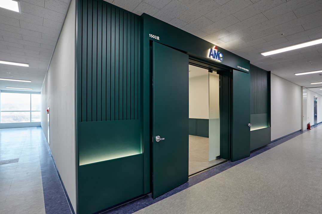 입구 및 아트월 디자인은 기업 로고가 돋보이는 딥그린 컬러 포인트 월을 중심으로