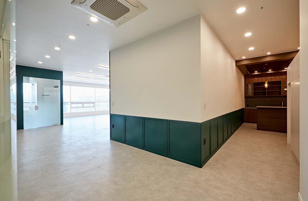 이번에 소개할 강남인테리어 중소형 사무실 공사는 그린 포인트 컬러와 우드 소재의 조화로 세련미를 더하고
