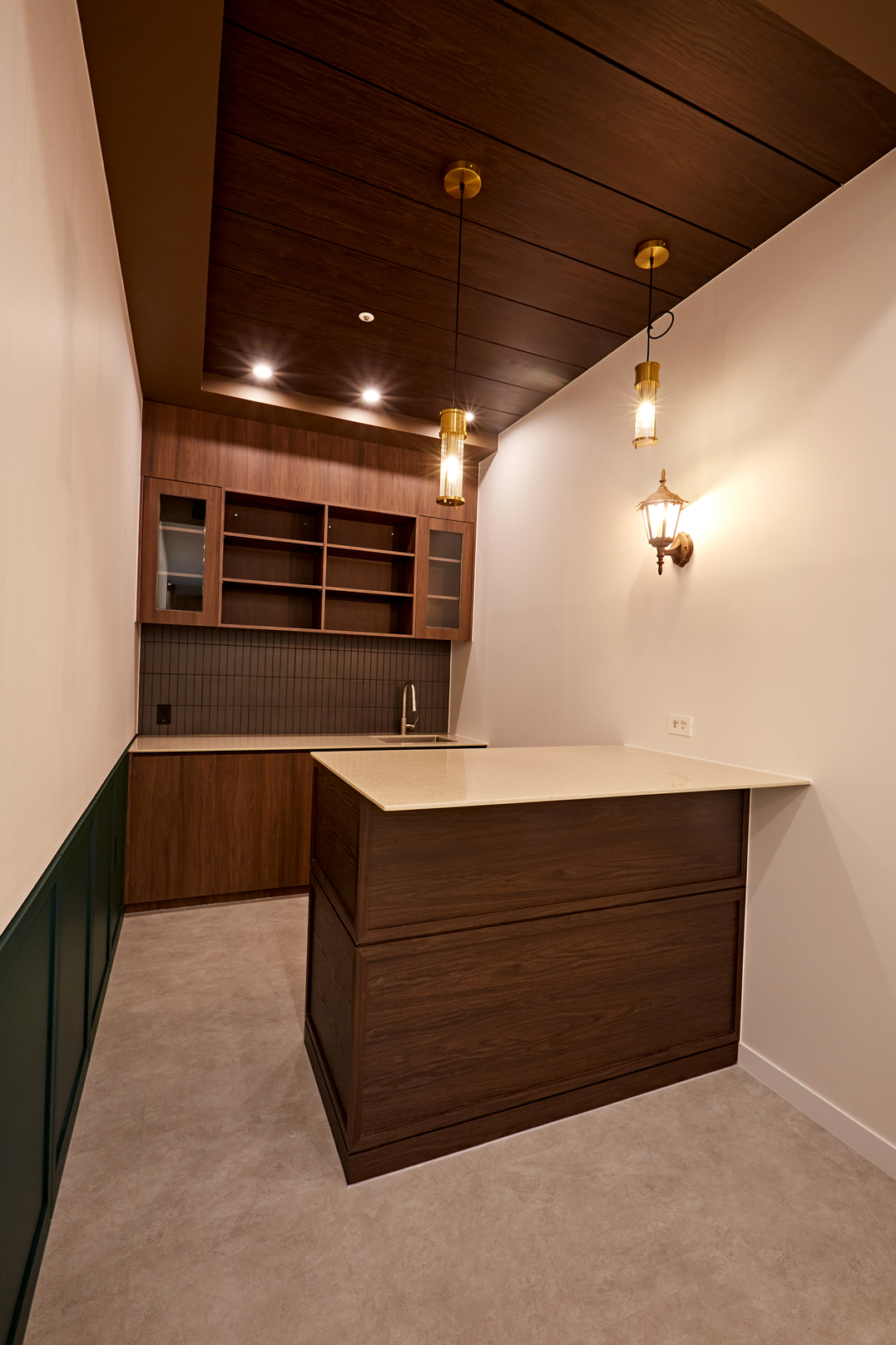 아트월 뒤 벽면으로는 카테페리아 공간이 있습니다. 사무실 내 휴게공간은 우드 싱크대와 우드 천장 마감을 동일 톤으로 맞춰
