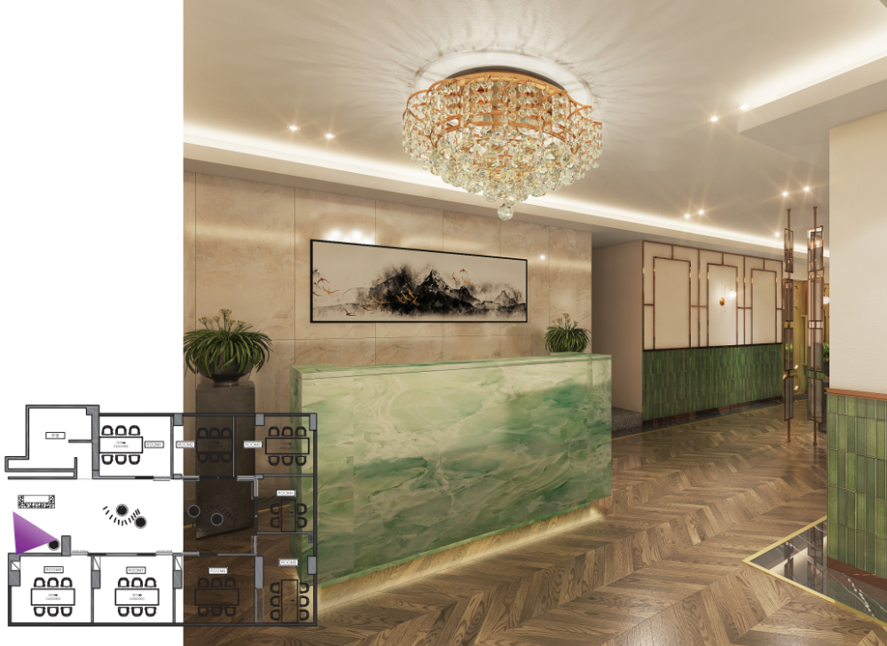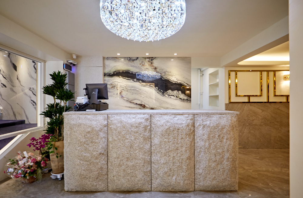 리셉션은 스톤 디자인과 대형 샹들리에로