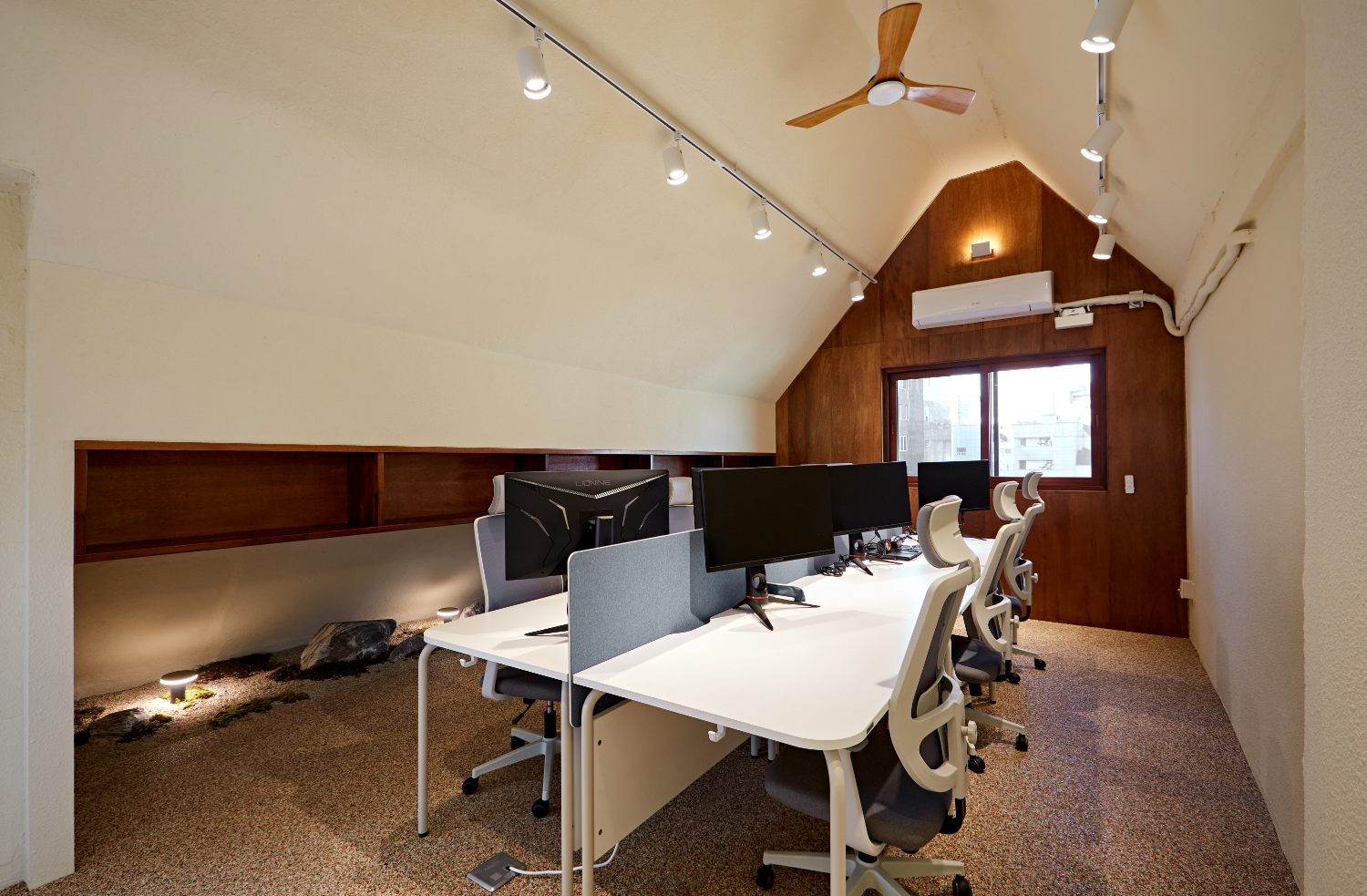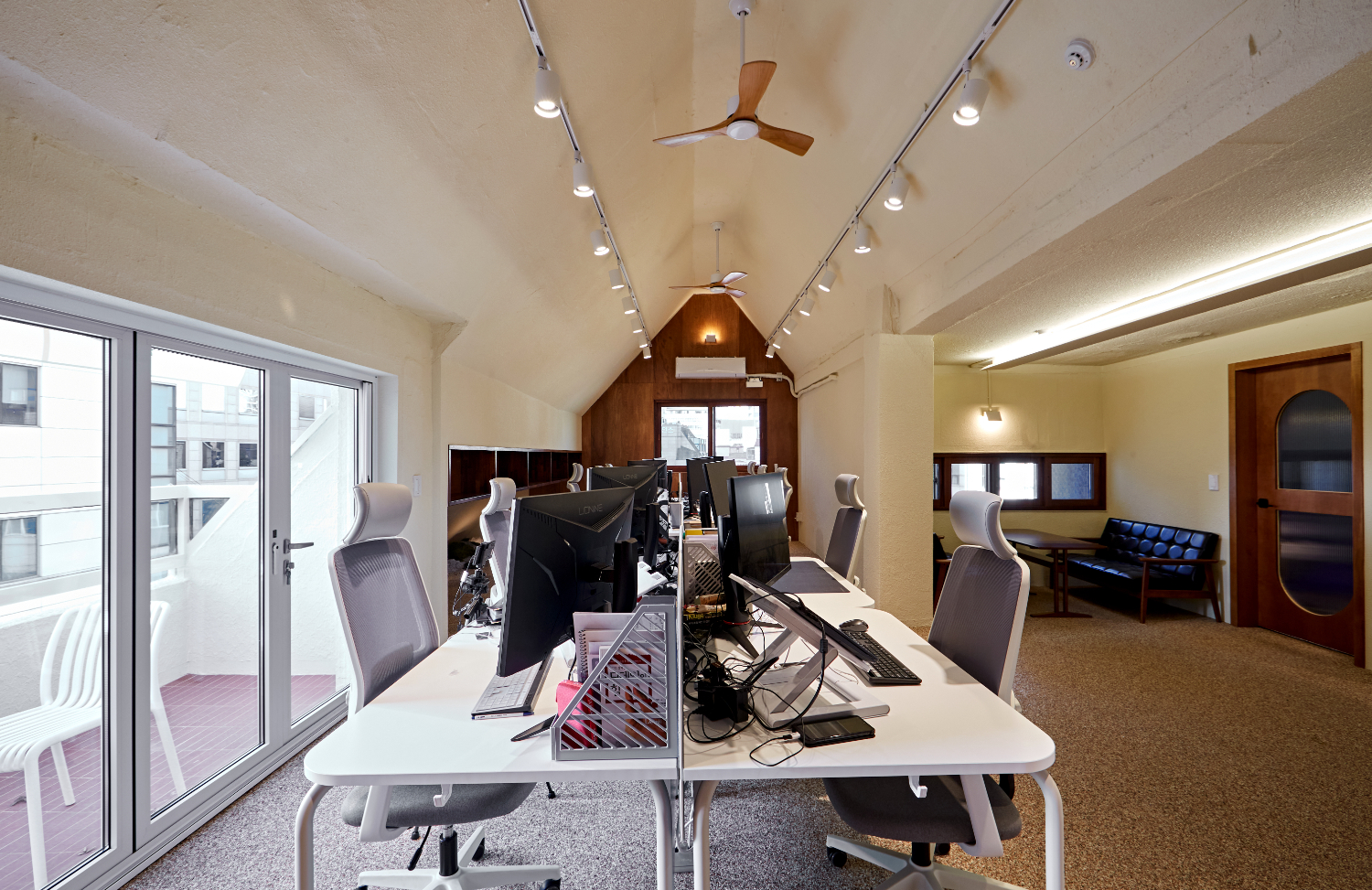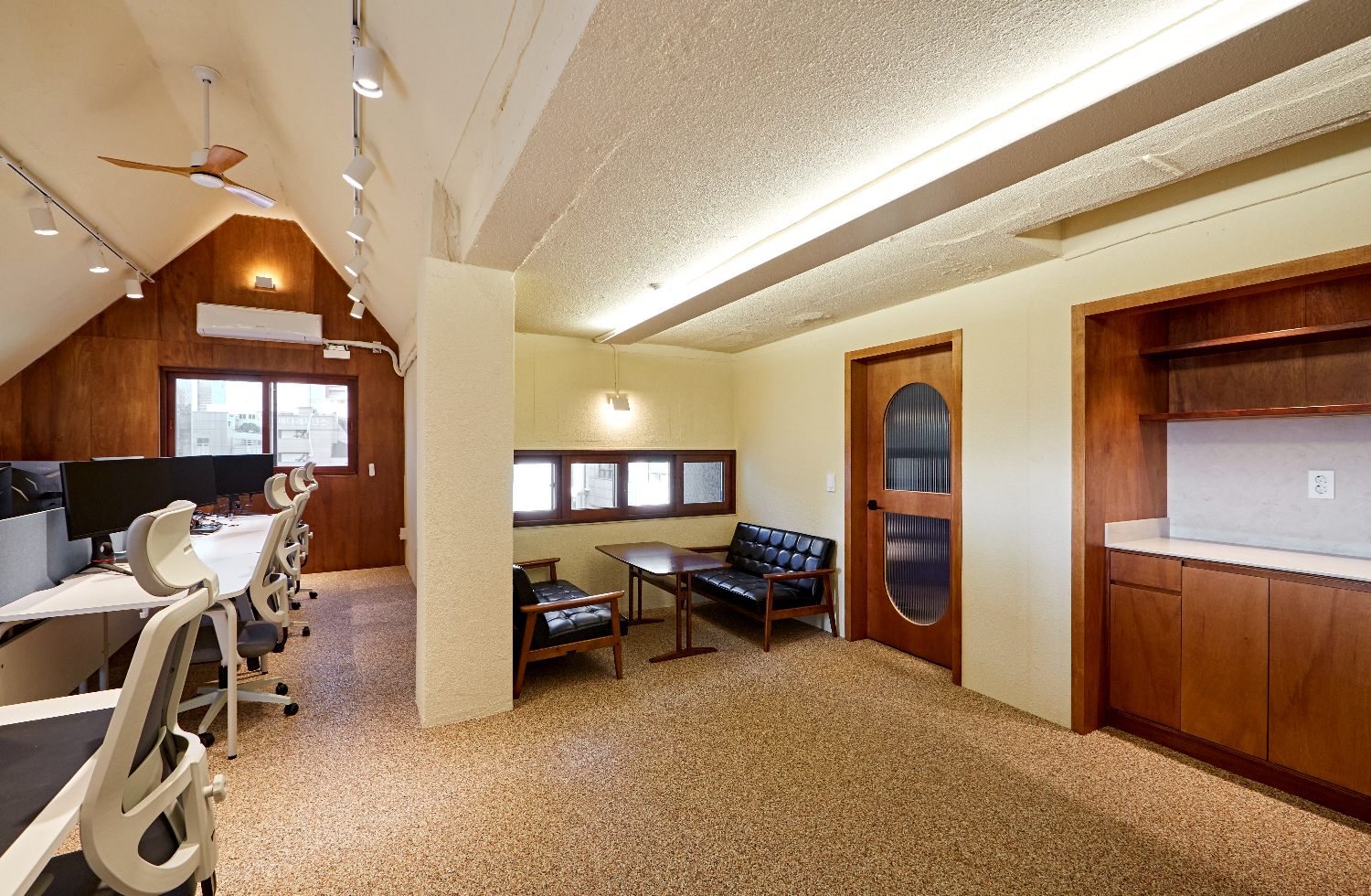 메인 오피스 공간의 천장에는 2열로 이뤄진 레일 조명 사이에 실링팬을 설치하였는데요. 실링팬은 공기 정화의 효과도 있으면서 그 자체로 인테리어 오브제 역할을 해주기도 합니다.