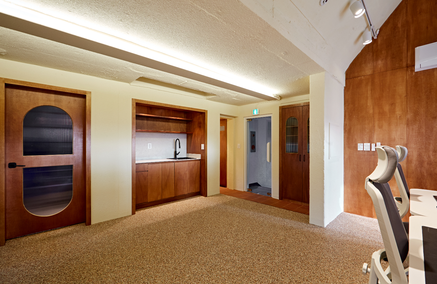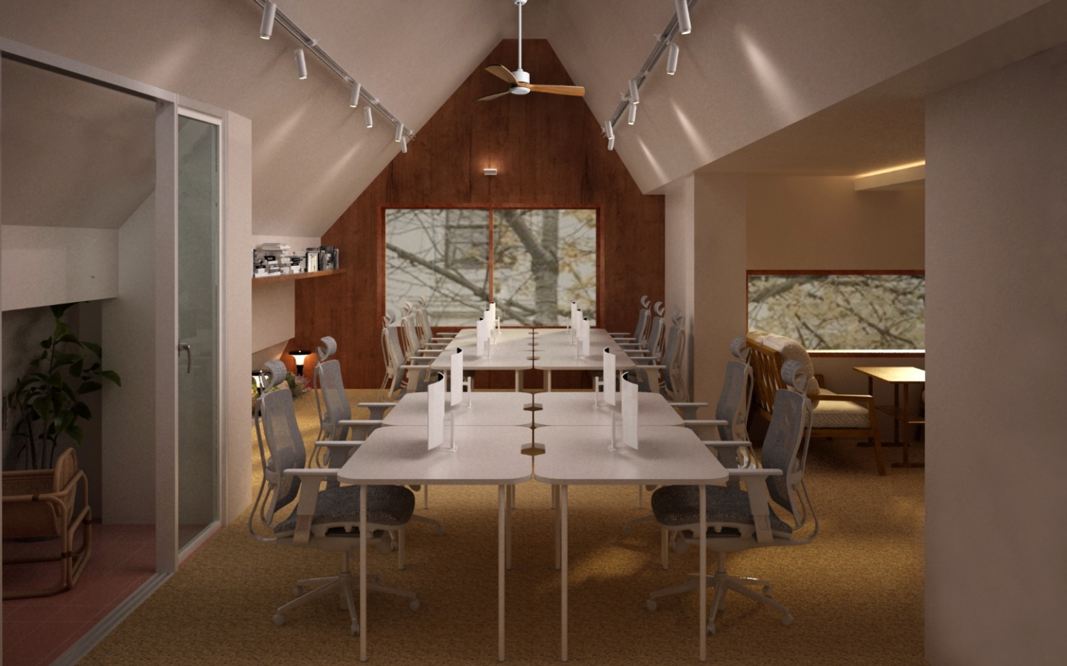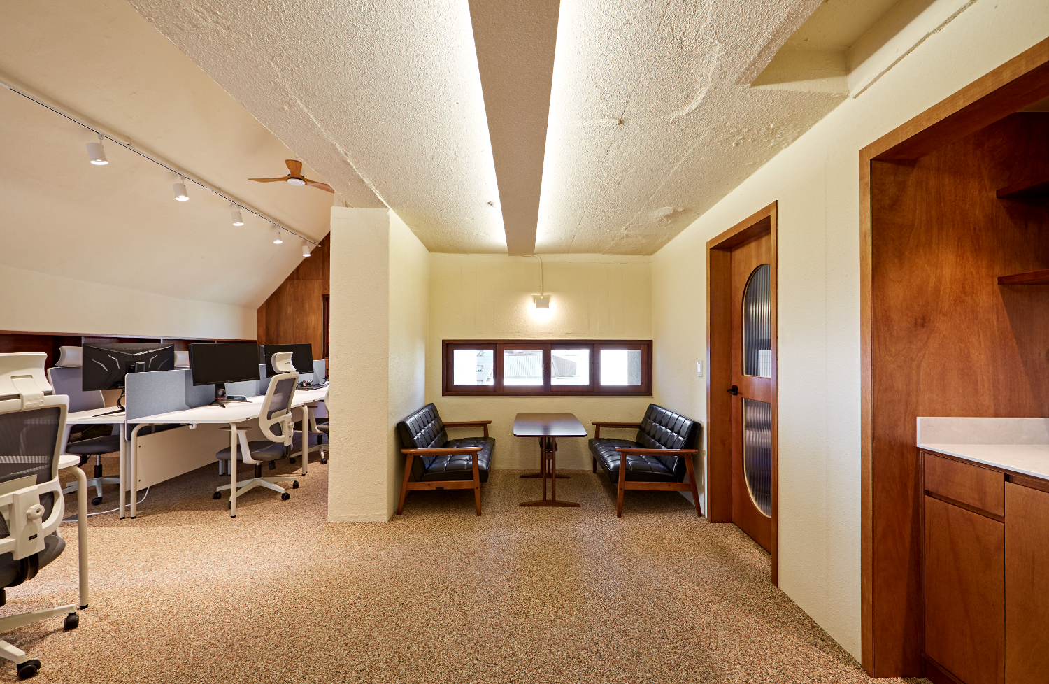 메인 오피스 공간의 천장에는 2열로 이뤄진 레일 조명 사이에 실링팬을 설치하였는데요. 실링팬은 공기 정화의 효과도 있으면서 그 자체로 인테리어 오브제 역할을 해주기도 합니다.