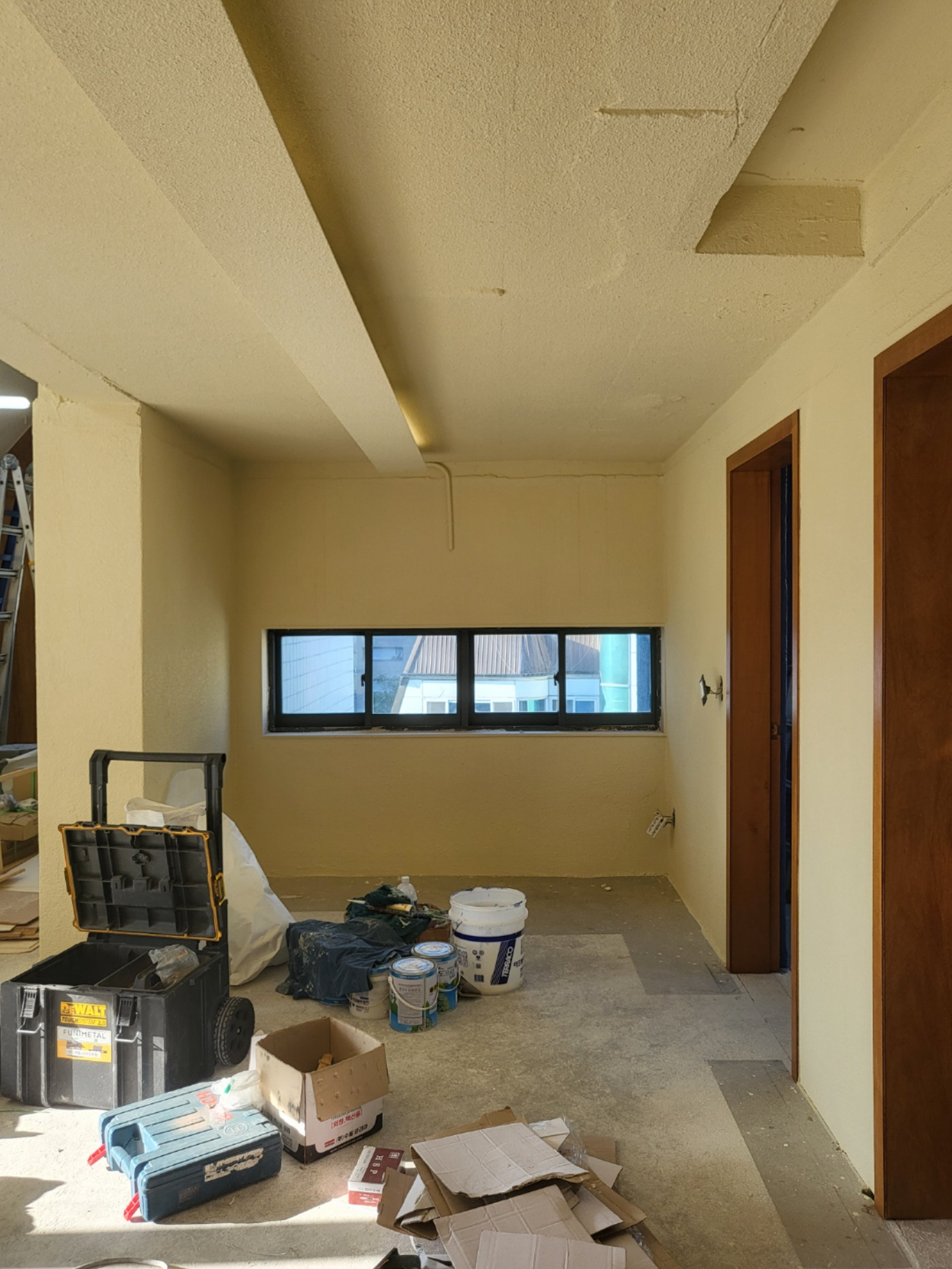 전체 벽은 우선 따뜻한 느낌을 낼 수 있는 연노랑 빛의 도장으로 마무리 하였습니다. 뭉치거나 부족한 곳이 없도록 곱게 펴바른 것은 물론 하나하나 공간을 완성해가고 있었는데요.