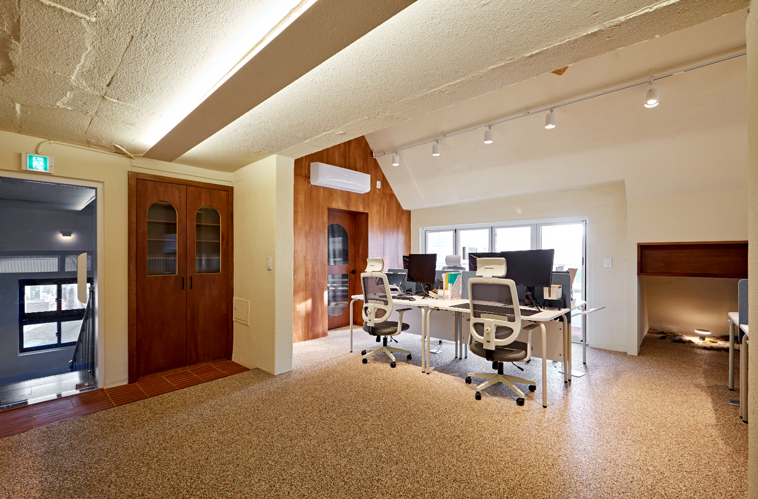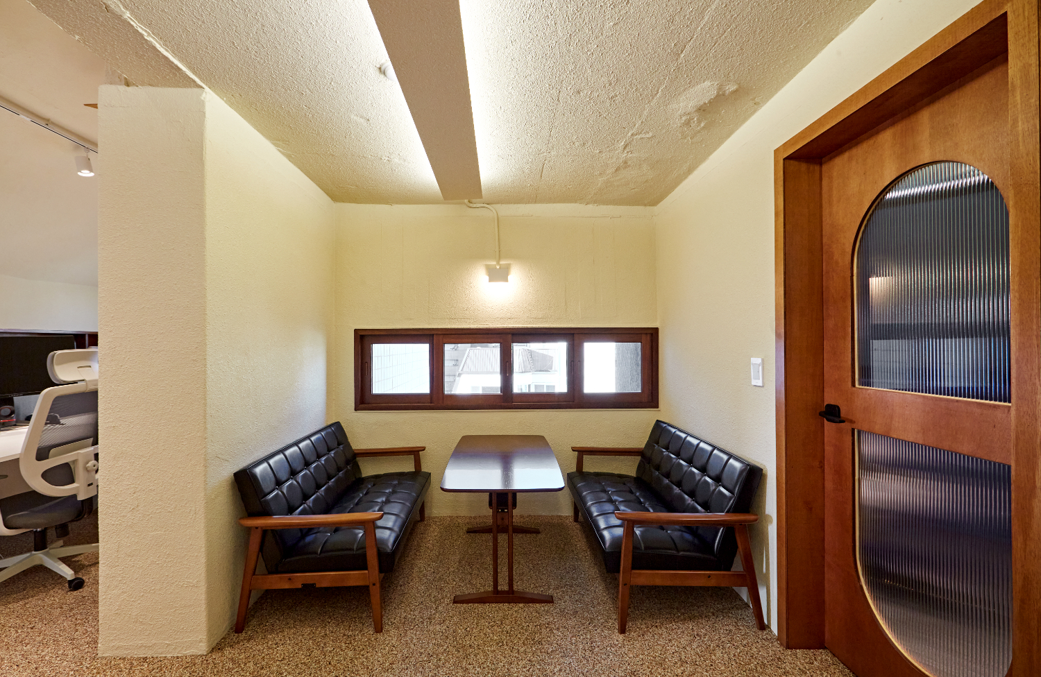 들어서면 콩자갈방식으로 따뜻한 분위기를 자연스럽게 연출하는 오피스 공간을 마주할 수 있습니다. 그리고 화이트 페인트가 아닌 연노랑 및 아이보리 색상을 선택하였기에 전체적으로 내츄럴한 느낌이 가득한데요. 정면에는 간단한 대기석 및 미팅이 가능한 테이블이 낮은 창문과 함께 놓여있고 도어 및 선반, 창틀의 우드를 통일하여 연결성을 주었습니다.