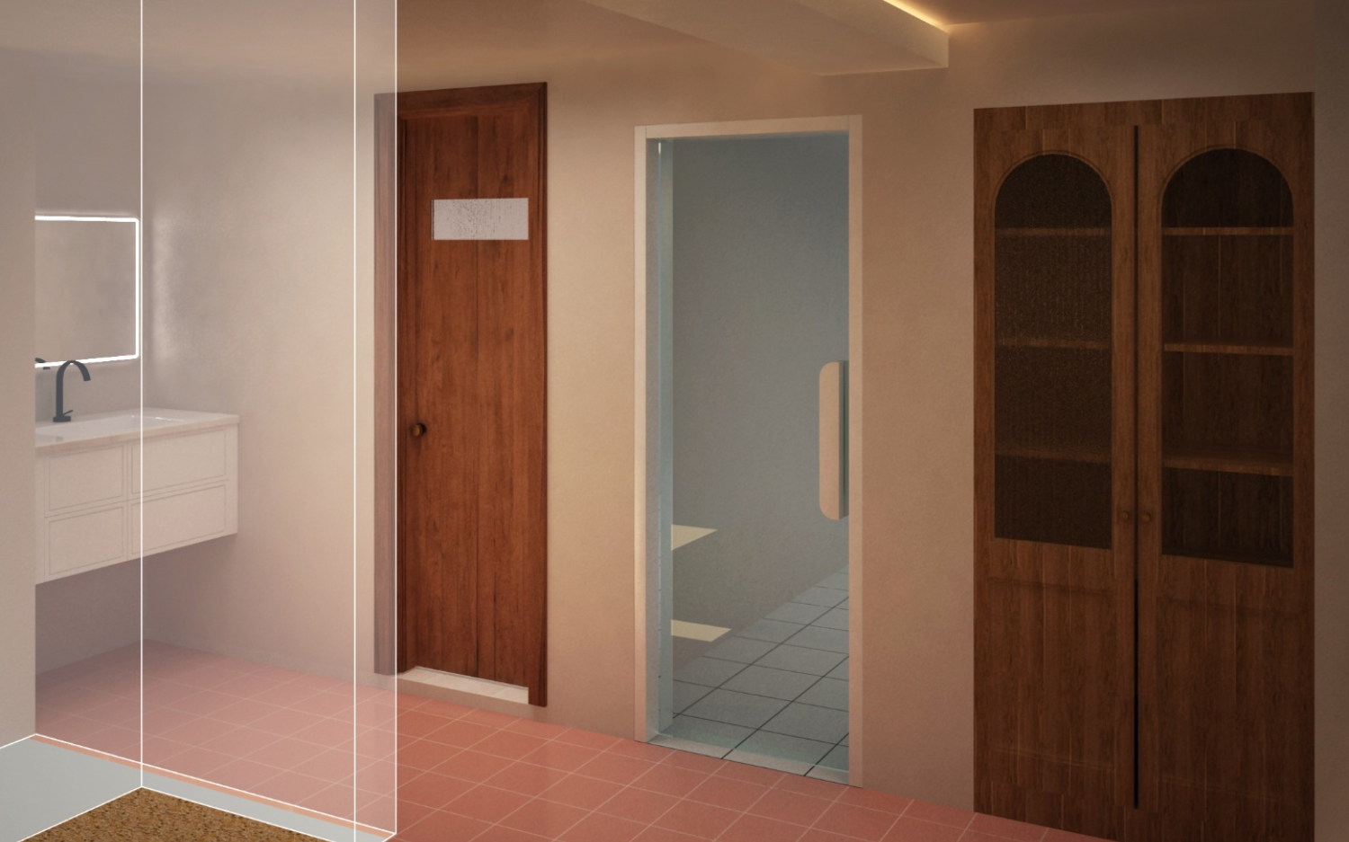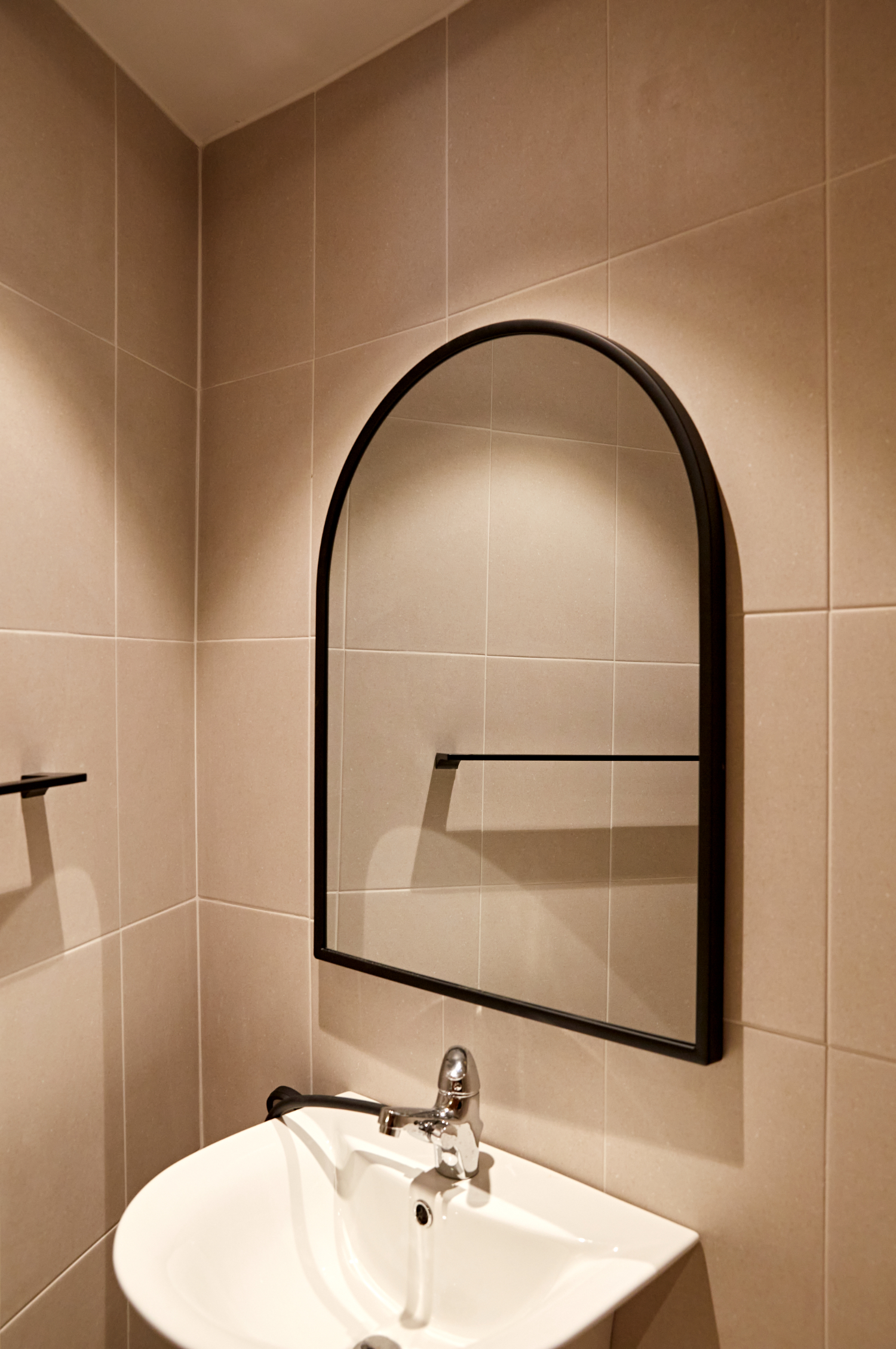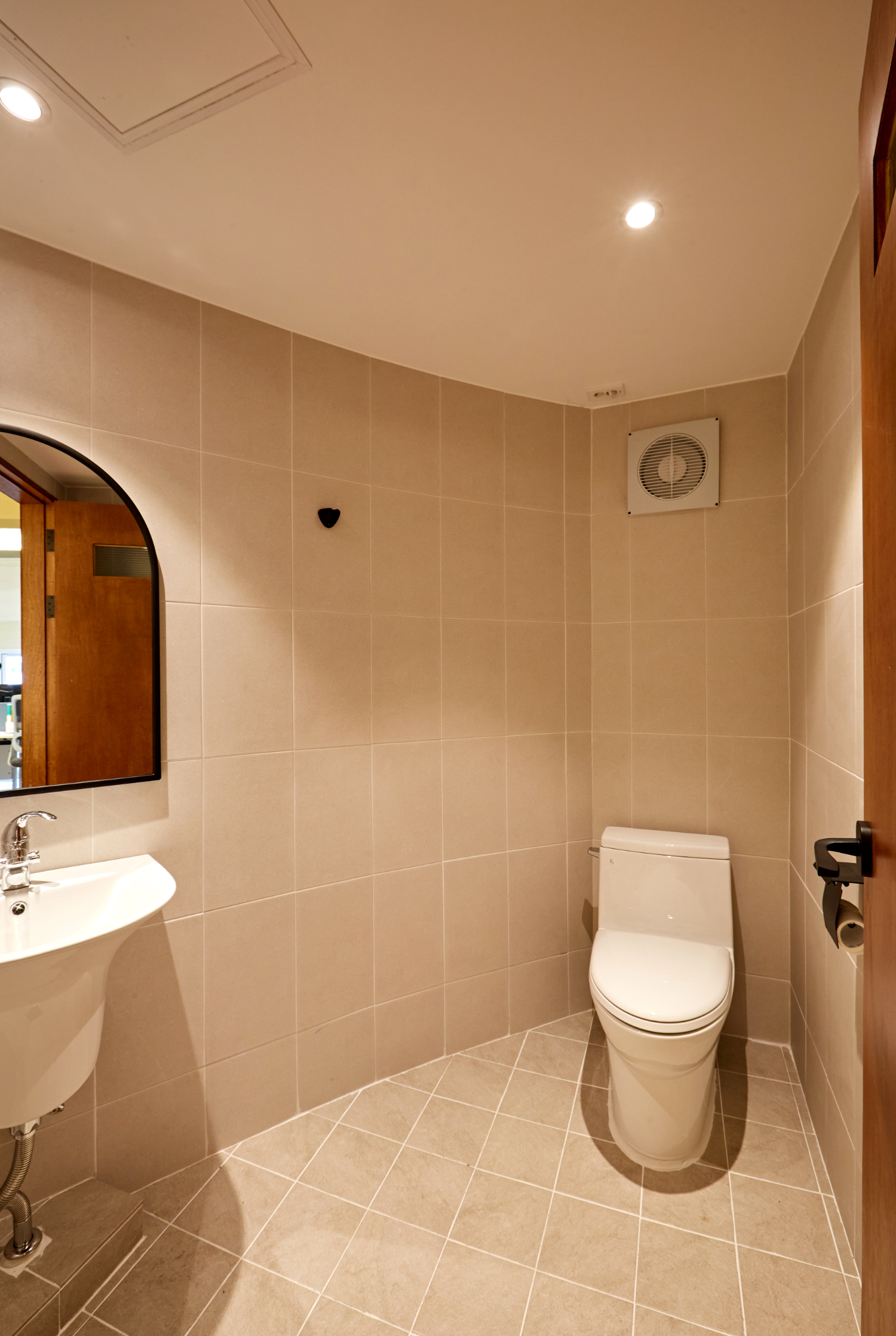 입구 바로 옆에는 화장실이 있었는데요. 바닥의 갈색 타일이 이국적인 분위기를 만들어주고, 거울 뒷면에 매립한 조명이 환한 분위기를 만들어주고 있습니다.