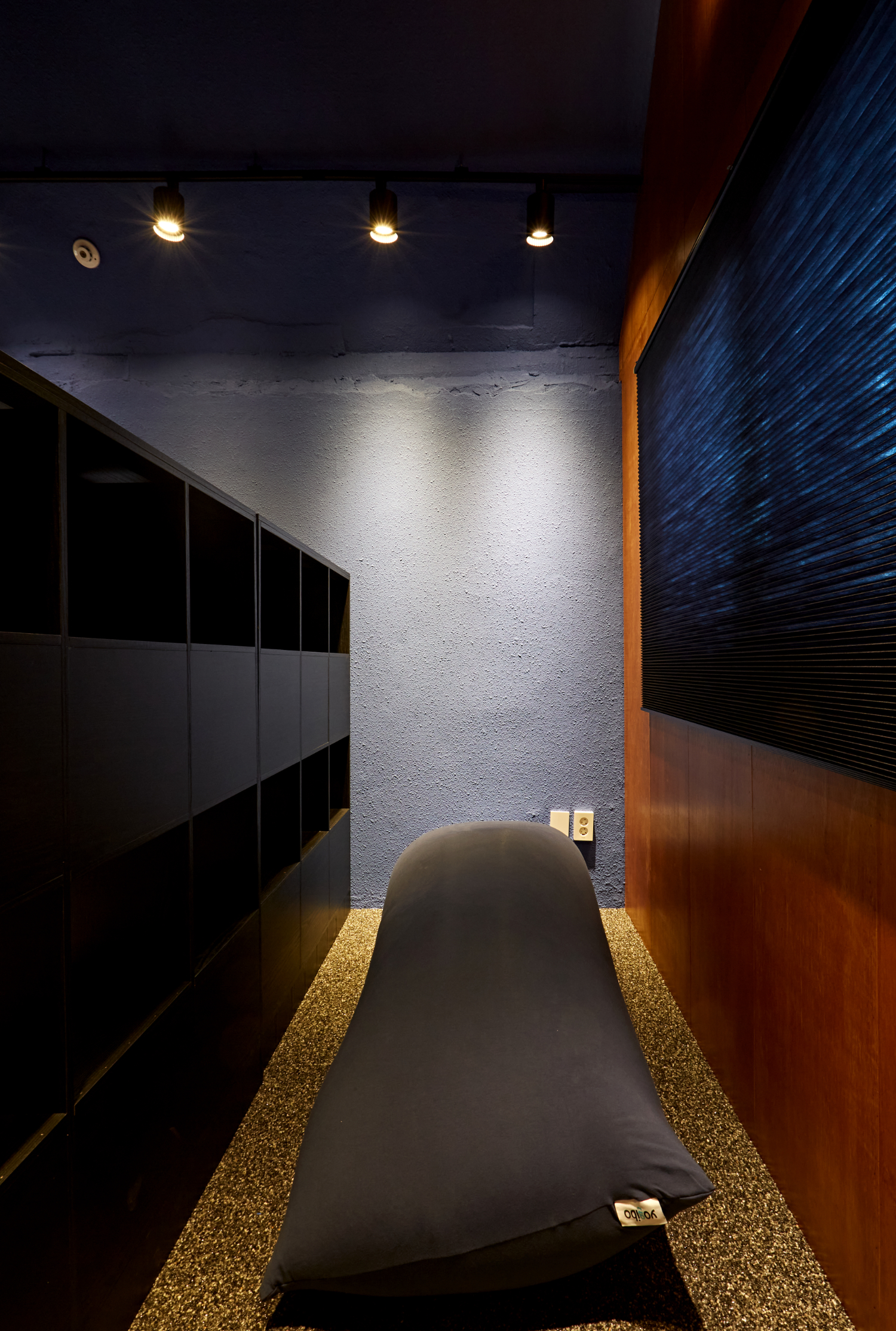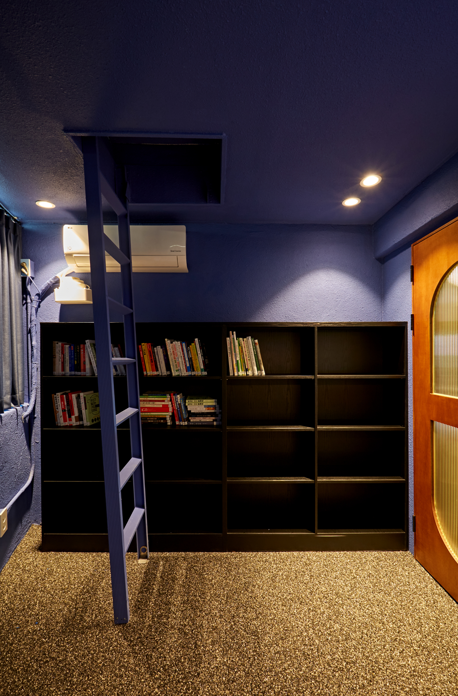 사무실 한 쪽에 있는 비밀공간 같은 곳은 네이비 컬러로 도장하여 차분한 느낌을 주었는데요. 마치 강남 논현동 사무실인테리어 30평 공간의 숨겨진 아지트같은 곳이었습니다. 직원들이 편안하게 휴식을 취할 수 있도록 배려한 색감이었고 안마의자는 물론 도서공간도 마련되어 있었습니다.