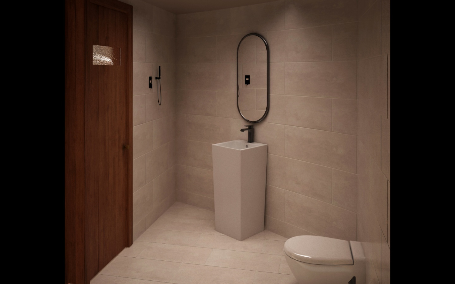화장실은 3D디자인에서도 볼 수 있었듯 세모난 모양의 특이한 공간을 활용한 고급스러움이 느껴졌는데요. 미니멀 인테리어의 정석을 보여주고 있으며 베이지색 타일로 아늑함을 더했습니다.