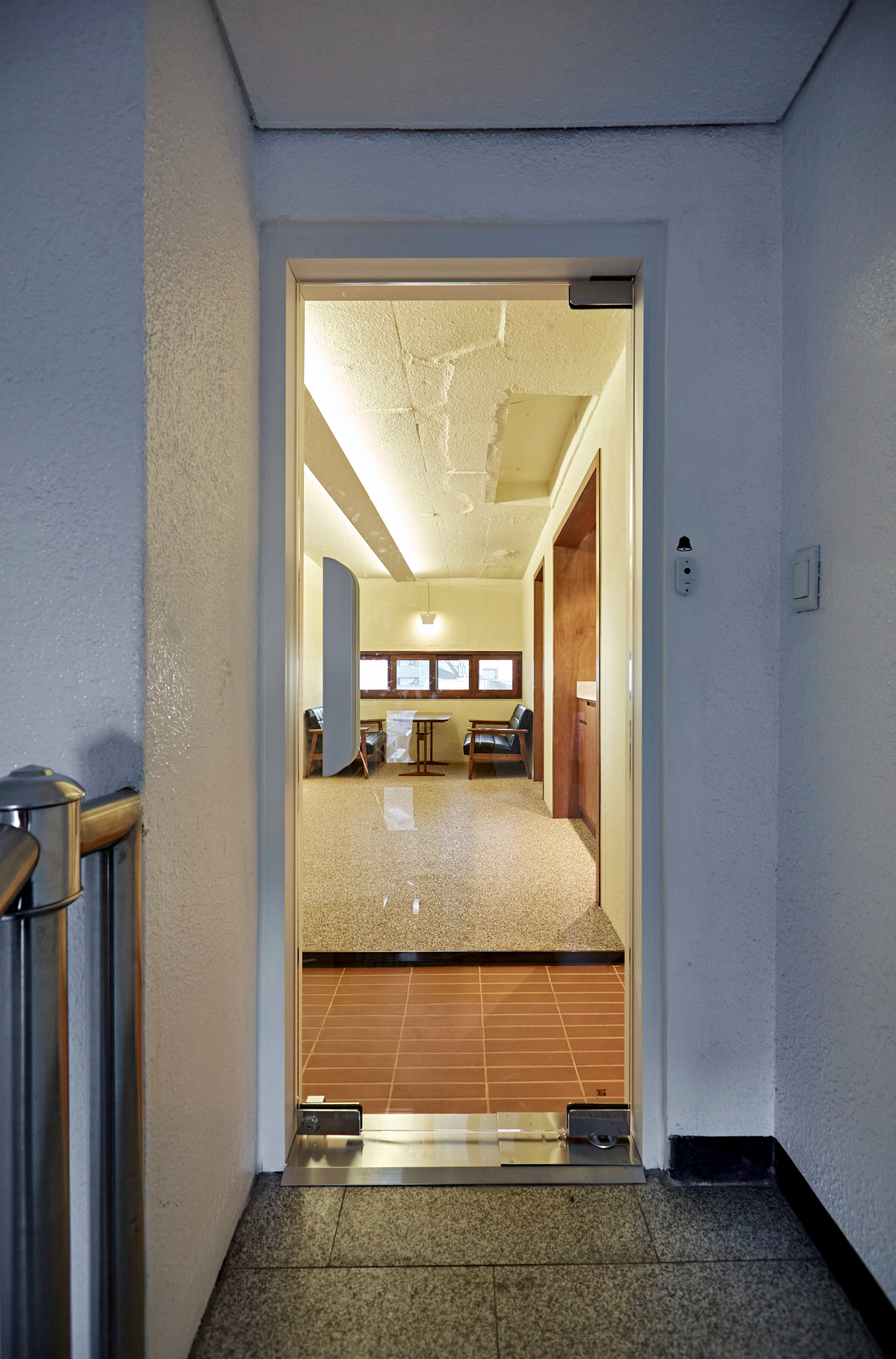 우선 입구 모습입니다. 흔히 건물의 옥상에 올라가면 볼 수 있는 듯한 스타일이지만 유리도어를 활용하여서 내부의 모습을 바깥으로 드러냈습니다. 삭막한 복도와는 다른 아늑한 빛을 내뿜는 내부 디자인은 반전 매력을 선사하고 첫 인상을 강렬하게 남기는 사무실인테리어가 될 수 있습니다.