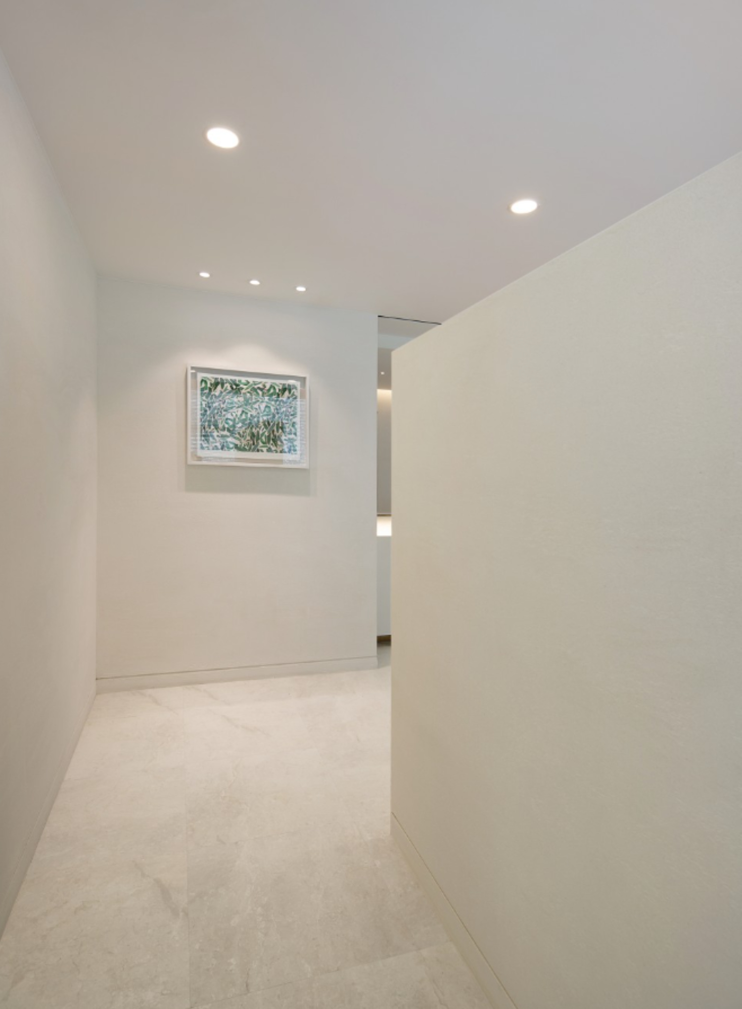 그렇다면 실제 강남 변호사사무실인테리어 현장을 살펴볼까요? 우선 입구에 들어서면 바닥의 대리석 타일과 화이트로 전체 마감된 복도를 마주할 수 있습니다. 조명은 보조등을 곳곳에 일정한 간격으로 설치하면서 은은한 빛이 나올 수 있도록 연출하였으며 벽면에는 마음을 가라앉히는 그린 색감의 그림을 걸어 평안을 추구했습니다.