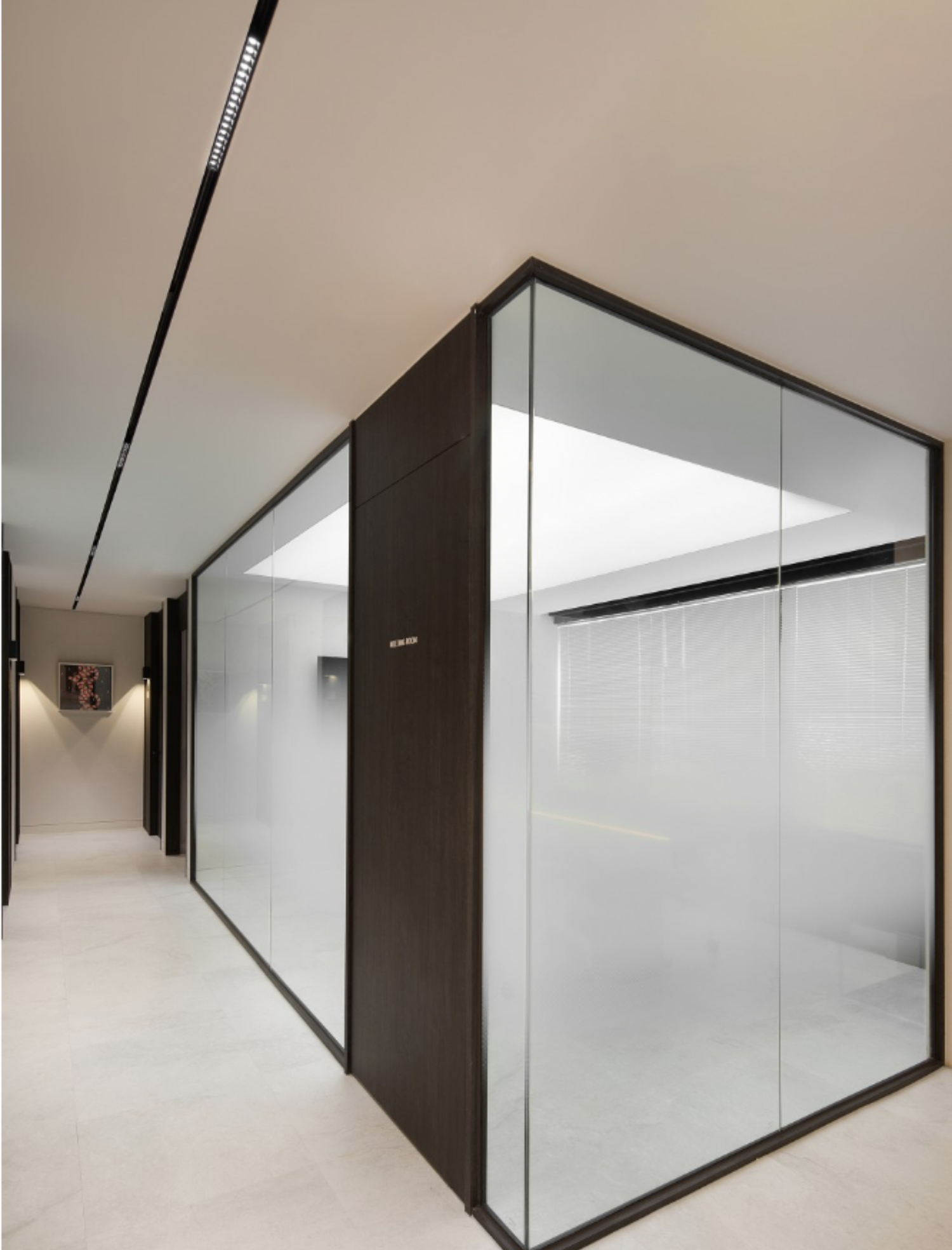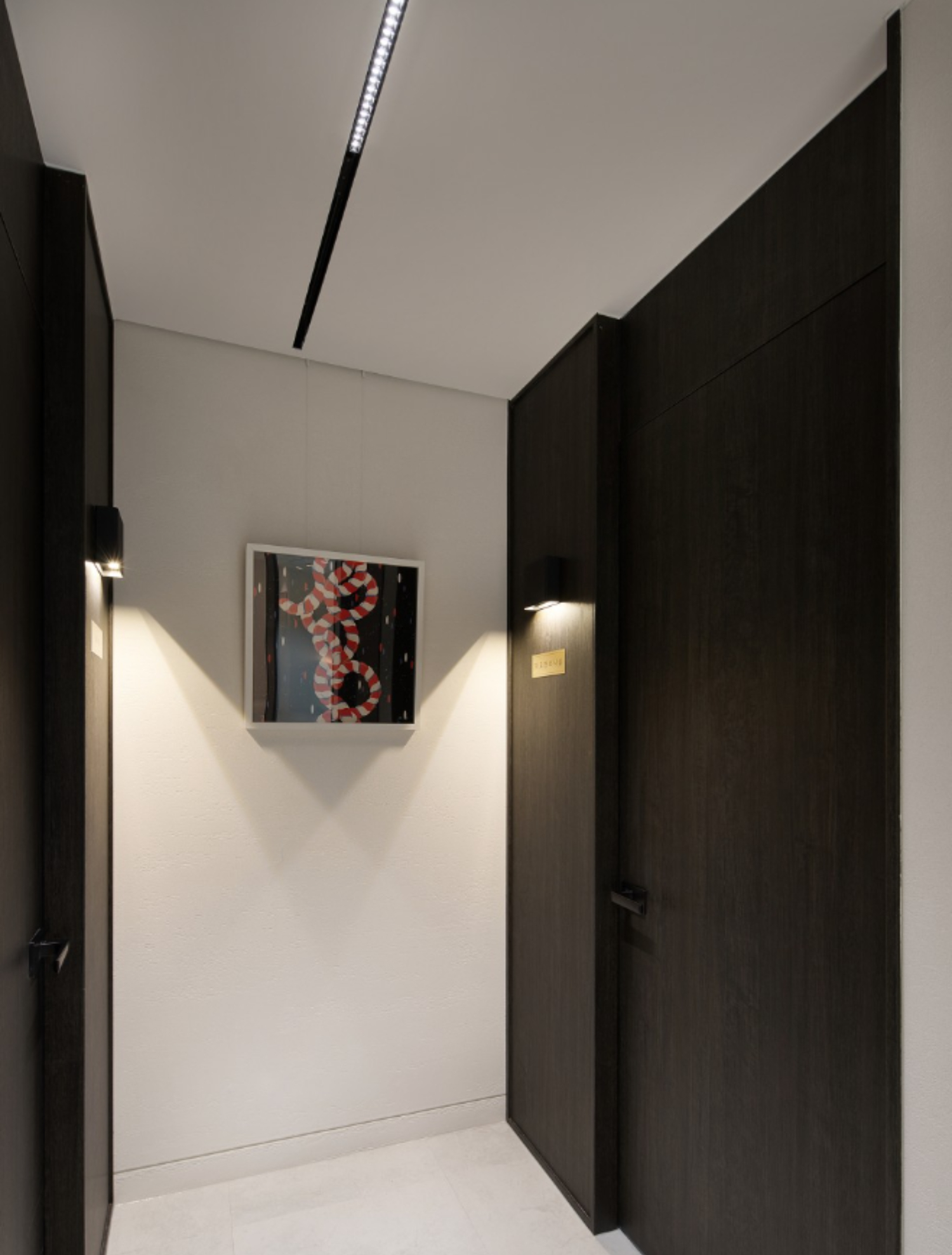 군더더기 없는 동선을 위해서 모든 프레임은 얇으면서도 세련되게 연출했고 이동하는 곳에 따라서 조명을 설치하여 편안한 이동을 지원하였습니다. 또한 도어에 명패 상단에 조명을 부착하여서 눈에 띌 수 있는 연출도 잊지 않았습니다.