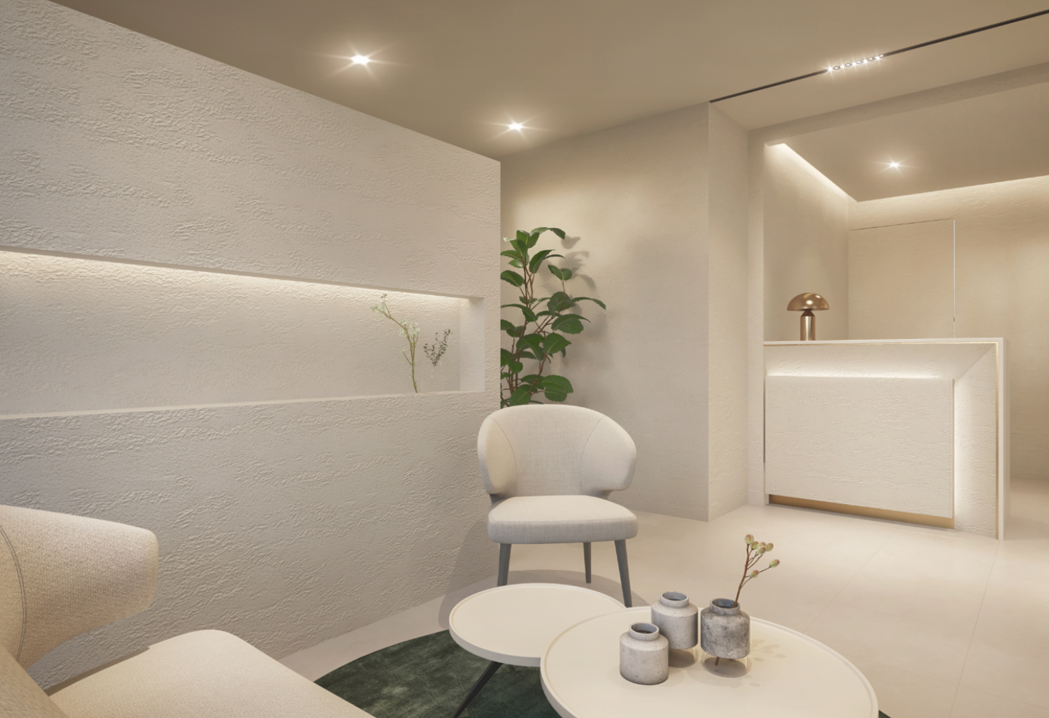 복도를 지나서면 간단한 응대와 상담을 받을 수 있는 곳이 나옵니다. 이곳도 라인에 조명이 매립되어서 은은한 조명을 비추고 있으며 전면에 입체적인 사각형을 배치하여 매력적인 연출을 시도하였습니다.