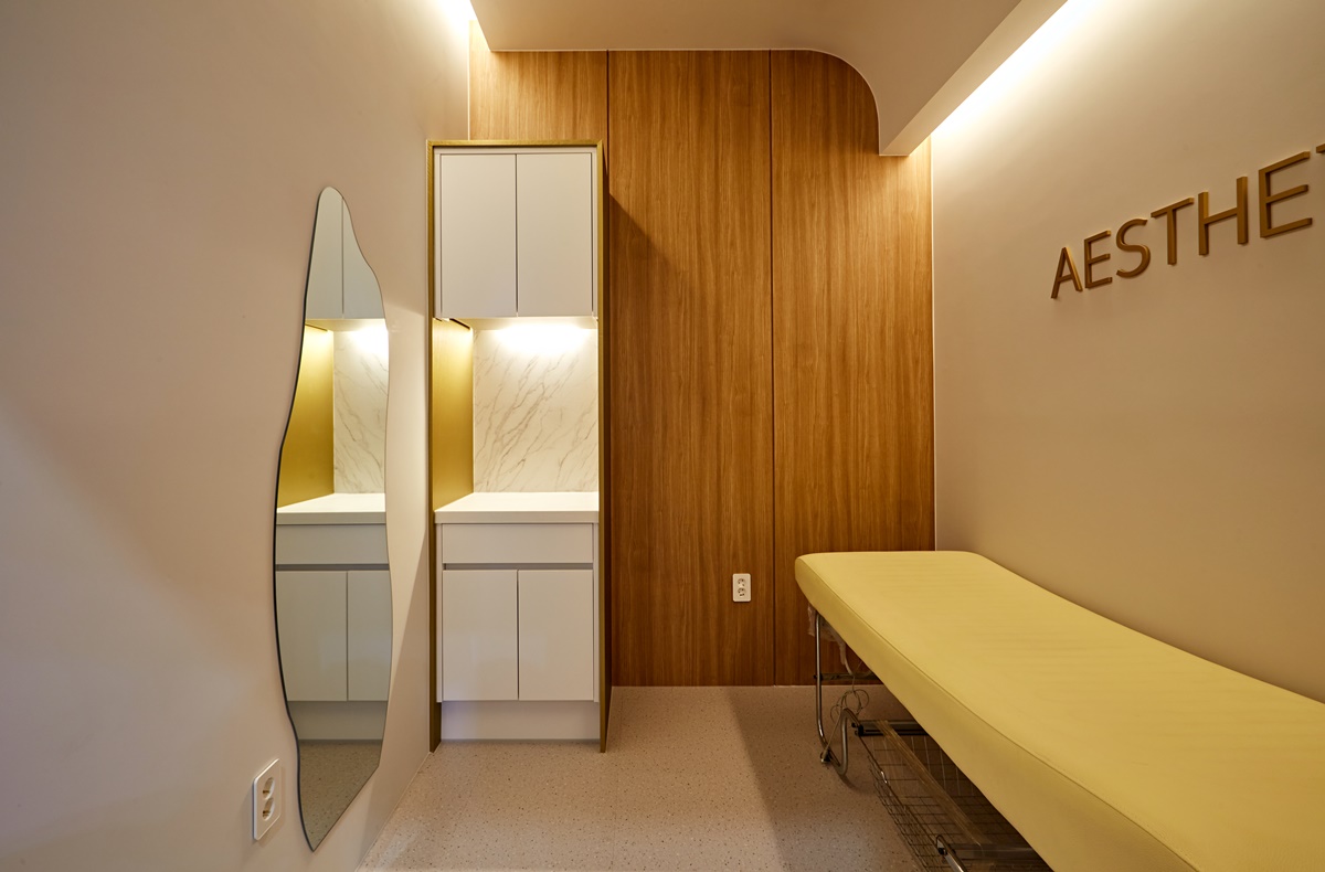 반면, 성인 환자를 위한 피부과는 차분하고 세련된 분위기를 조성해 안정감을 주고 있어요.