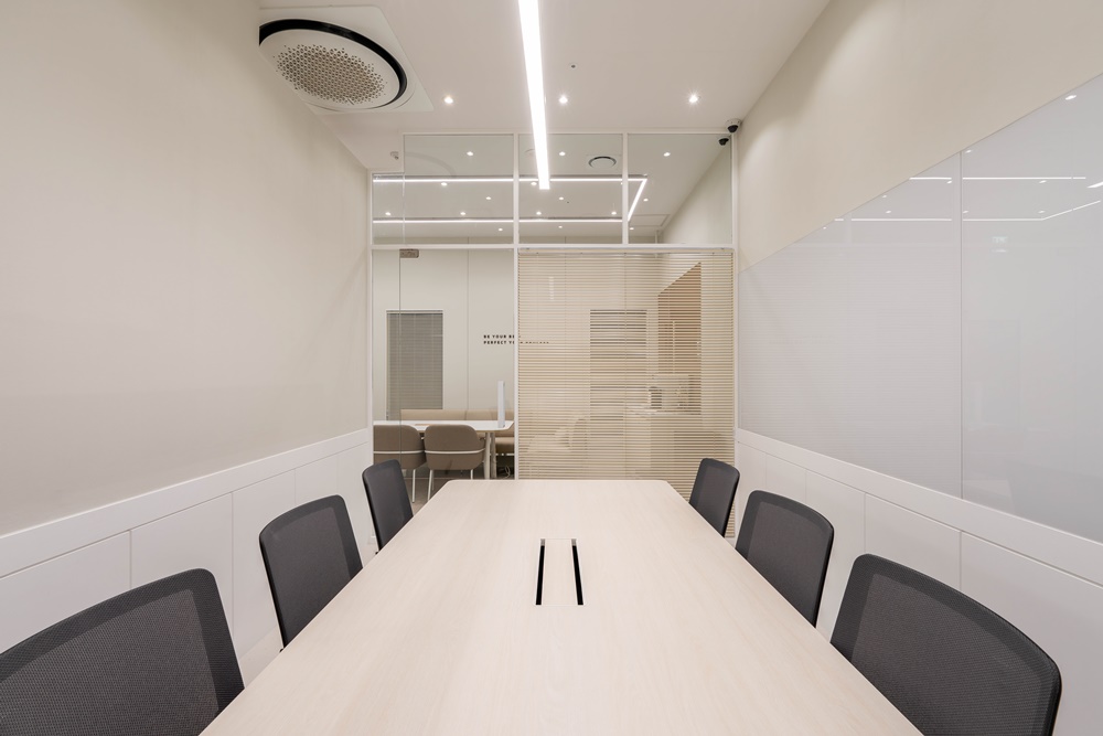 전면 통유리창에 블라인드를 설치하여 개방감과 프라이버시를 동시에 챙겼고, 한쪽 벽면은 대형 유리 보드를 매립 시공하여 판서의 편리함까지 확보했답니다.