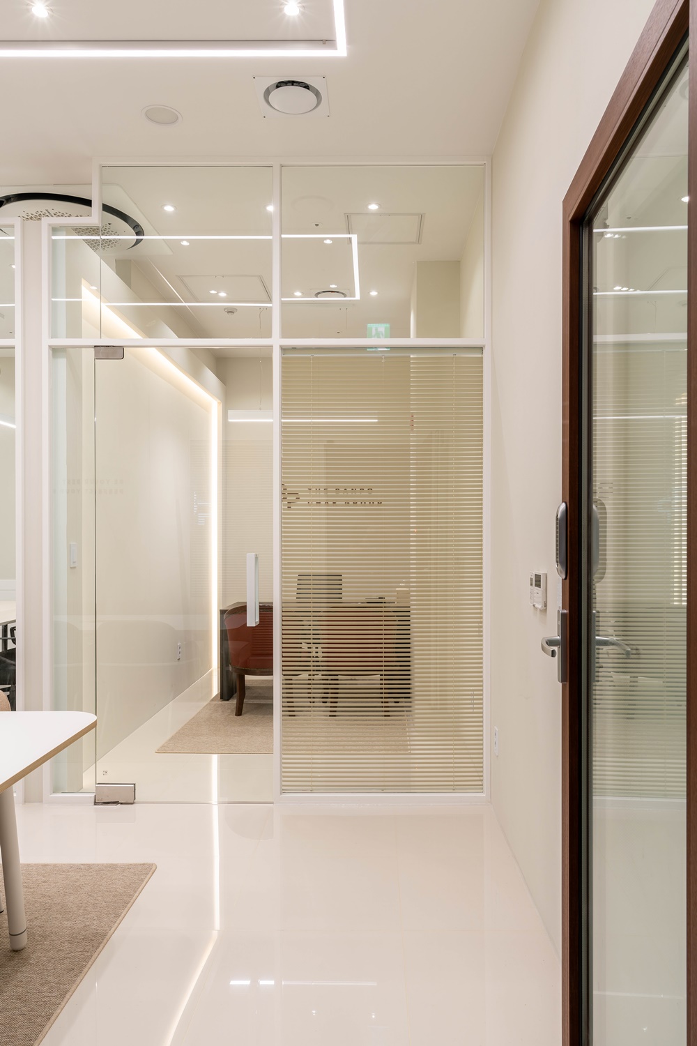 화이트 프레임으로 깔끔하게 마감된 유리창 너머로 내부 상담실의 차분한 분위기가 살짝 비치며, 가로형 알루미늄 블라인드를 통해 세련된 직선미를 더했답니다.