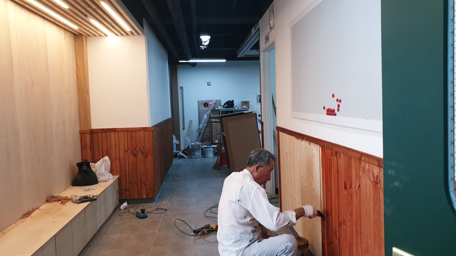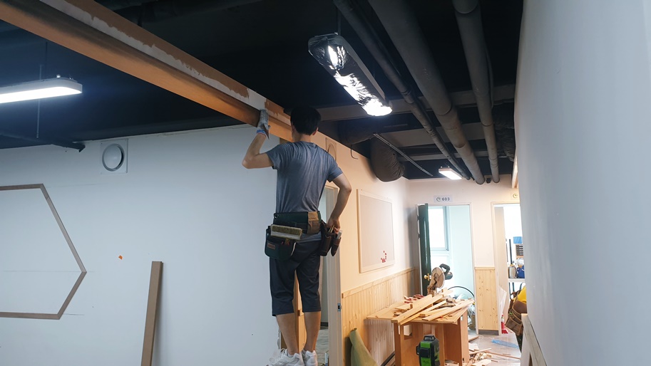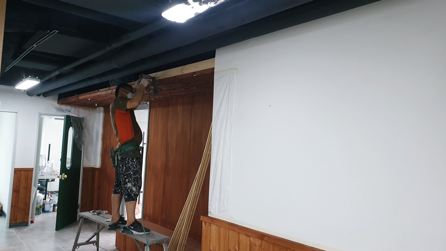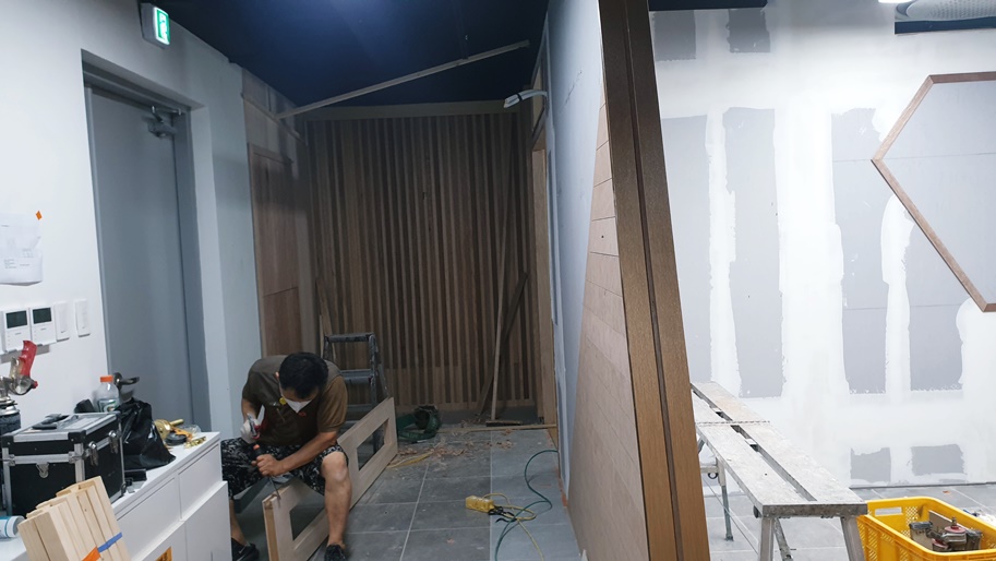 석고보드로 천장을 덮어준 후 가벽을 만들어 레이아웃에 맞게 공간을 구분하는데 이 과정에서 학원인테리어의 필수인 방음재 작업이 이뤄집니다. 무게가 있는 거울, TV, 선반 등 벽에 피스로 고정해야하는 위히에는 합판을 부착해 단단하게 고정해서 안전하게 사용할 수 있도록 해주고 밑작업이 끝나면 장식 목공 작업을 진행하며 마감 도장을 완성하면 공사는 마무리됩니다.