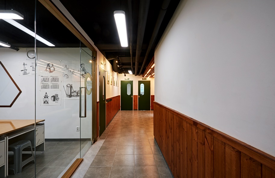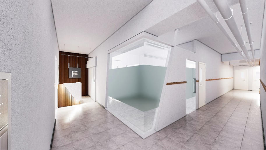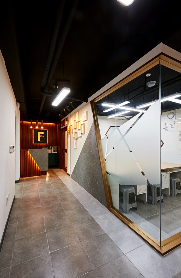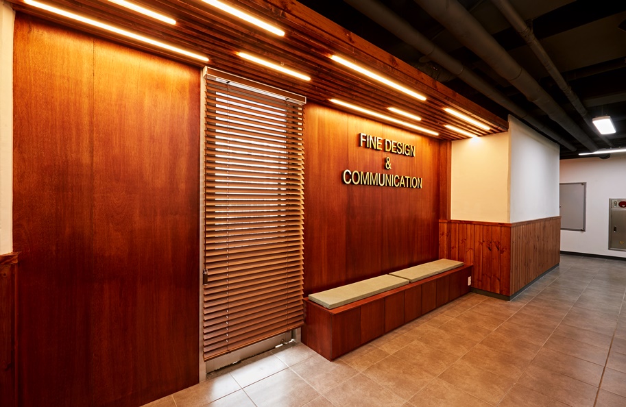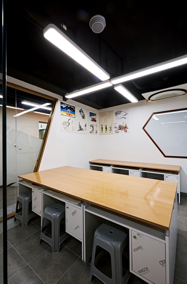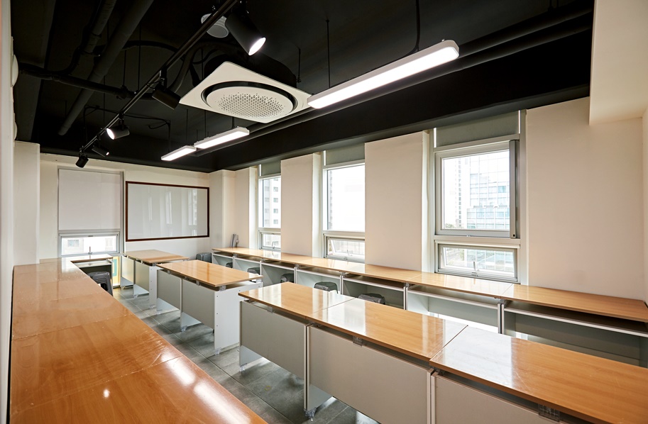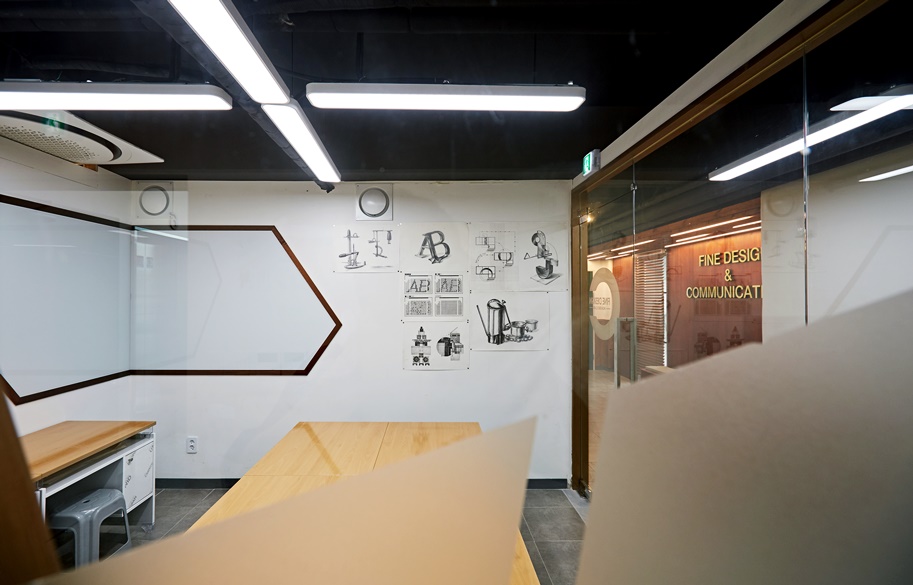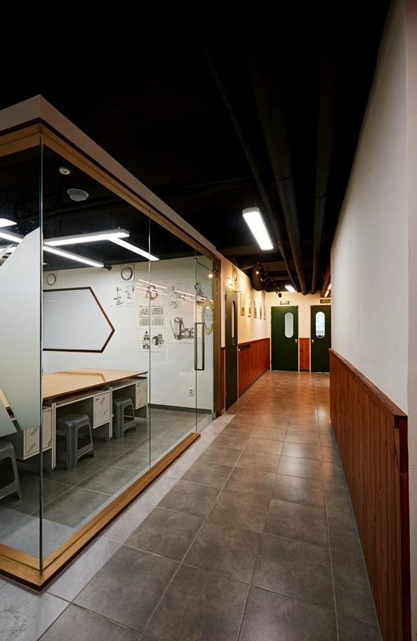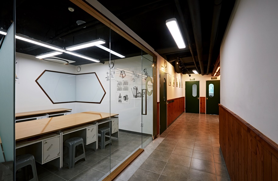 강의실로의 이동은 복도형식으로 만들었습니다. 각 강의실을 가벽을 세워 공간을 나눴기 때문에 생긴 복도인데요, 코너 공간은 유리가벽을 적용해 답답하지 않고 확장돼보여 넓은 느낌이 듭니다. 유리가벽인 덕분에 공간과 복도의 조명이 상호작용을 해 더욱 밝아 보이는 시너지가 생길 수 있어 복도라는 생각보다는 오히려 또 하나의 공간이란 생각이 들 정도입니다.