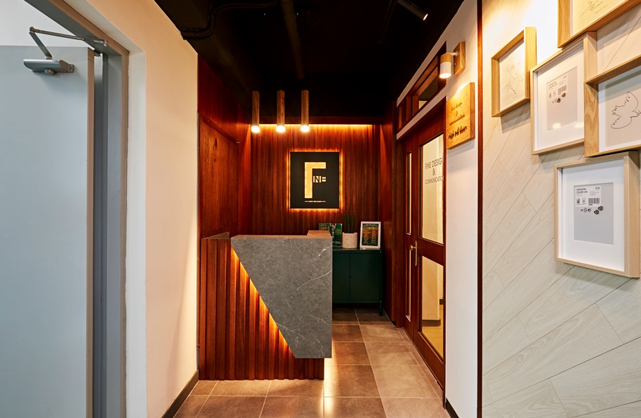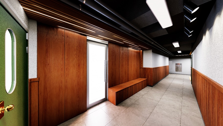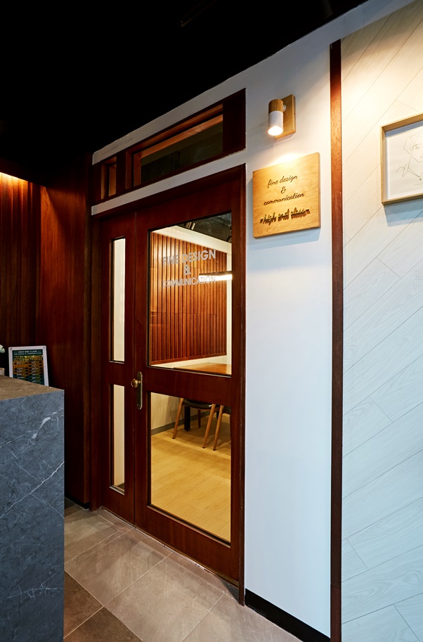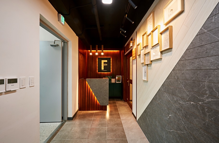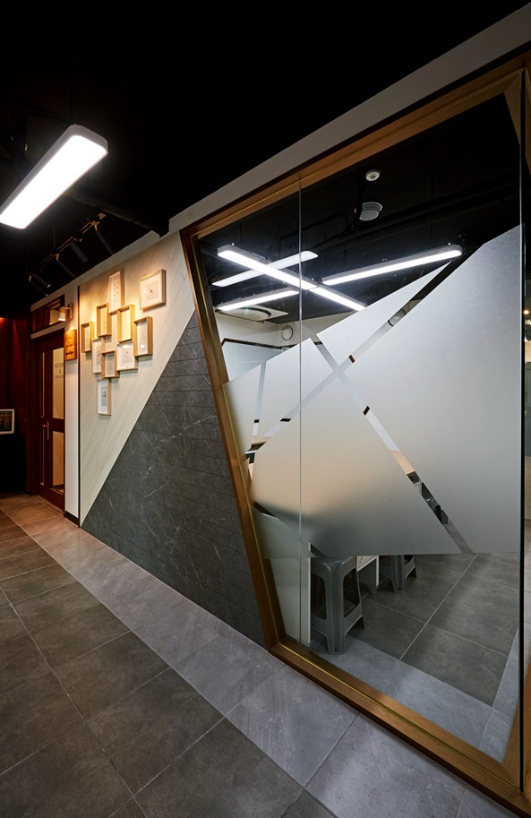 인포메이션은 진갈색 우드톤으로 컬러를 설정해 클래한 느낌이 들게했고 은은한 간접조명을 더해 고급스러운 인테리어를 완성했습니다. 인포데스크는 벽면의 사선 디자인을 적용해 우드톤 템바보드와 대리석으로 디자인했고 단차 사이에 간접조명을 넣어 그라데이션 느낌을 주었습니다. 뒷 벽면에는 간판을 설치해 포인트가 되면서 인지성을 높였고 간접조명을 설치해 멀리서 봐도 입구임을 단박에 알아볼 수 있도록 했습니다.