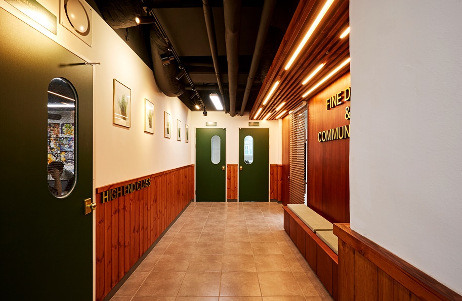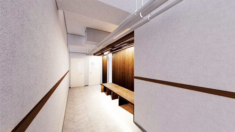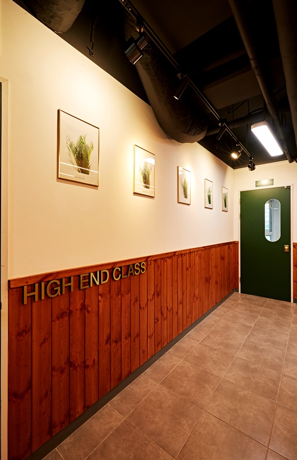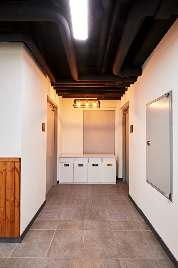 본격적인 레슨 공간으로 진입하는 복도의 벽면은 화이트와 우드를 적절하게 매치했는데요, 상하부의 비율을 다르게 해 복도가 좀 더 넓고 길어 보여 넓은 느낌이 드네요. 화장실이 있는 곳은 우드를 적용하지 않은 화이트 벽면으로 인테리어해 깨끗하고 위생적인 느낌을 강조했고 분리 수거를 할 수 있는 휴지통을 배치해 깔끔하게 사용할 수 있도록 했으며 천장에 메탈 소재의 조명을 설치해 세련된 분위기를 조성했습니다.