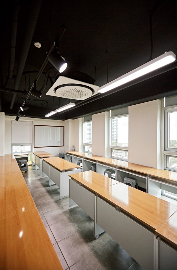 강동구 노원 양주 카페같은 학원인테리어, 고급스럽게 연출하고 싶다면 강의실 분위기의 통일성을 이루도록 하는 것이 좋습니다. 전체적으로 화이트톤을 적용해 화사하고 쾌적한 느낌이 들도록 했고 노출천장으로 층고를 확보했으며 레일조명, 라인조명, 팬던트 조명 등을 적절히 시공해 충분한 조도를 확보했습니다.