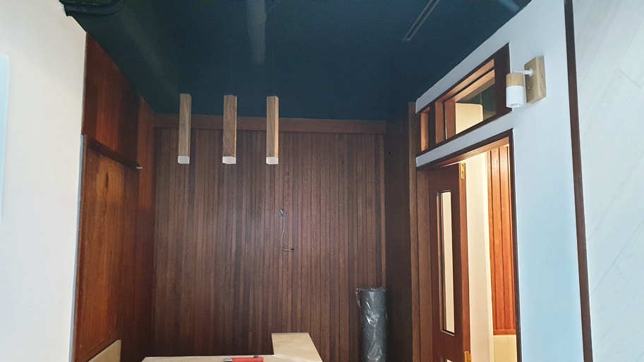 천장을 블랙으로 마감하면 중압감이 느껴서 공간에 짓눌리는 느낌을 받을 수 있지만 이번 현잔은 노출천장으로 층고를 높였기 때문에 그런 문제점은 없고 오리혀 깊은 느낌이 들어 천장이 더욱 높게 느껴지는 효과가 있었습니다.