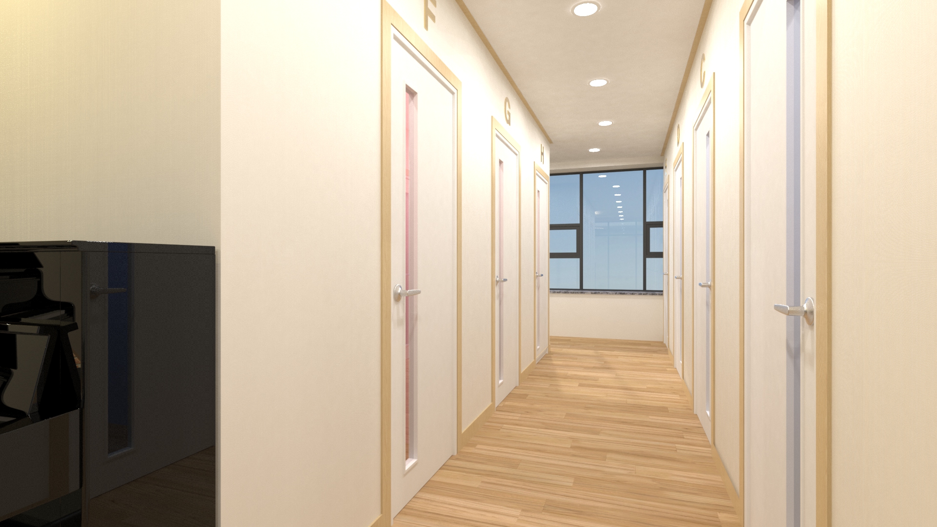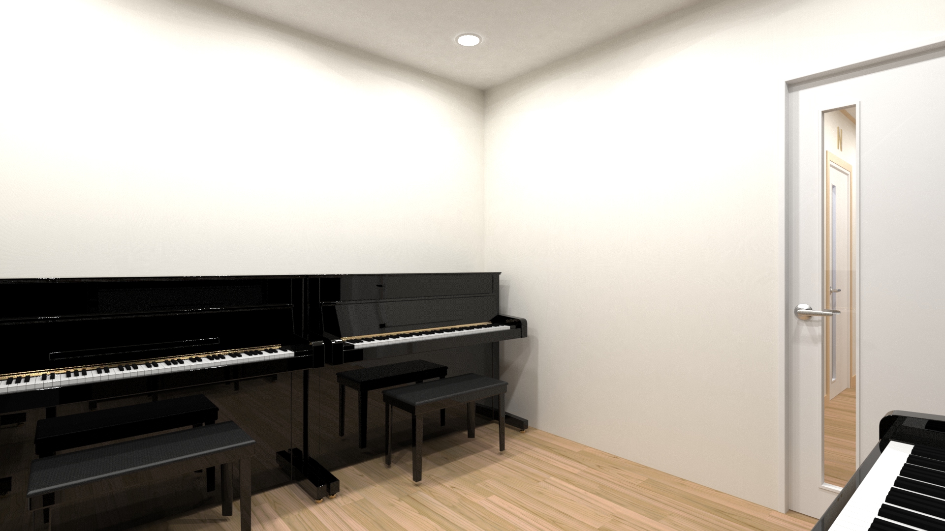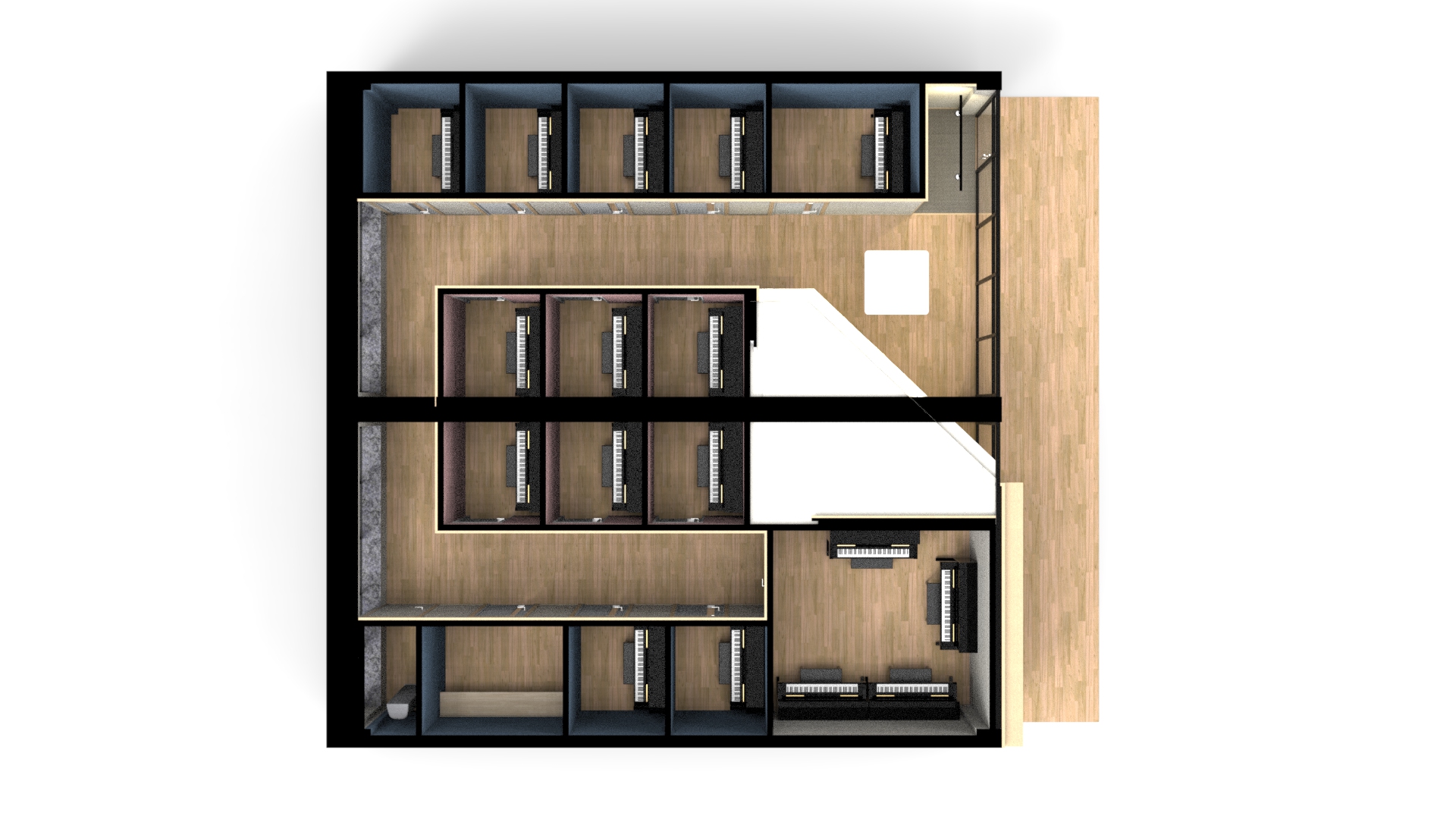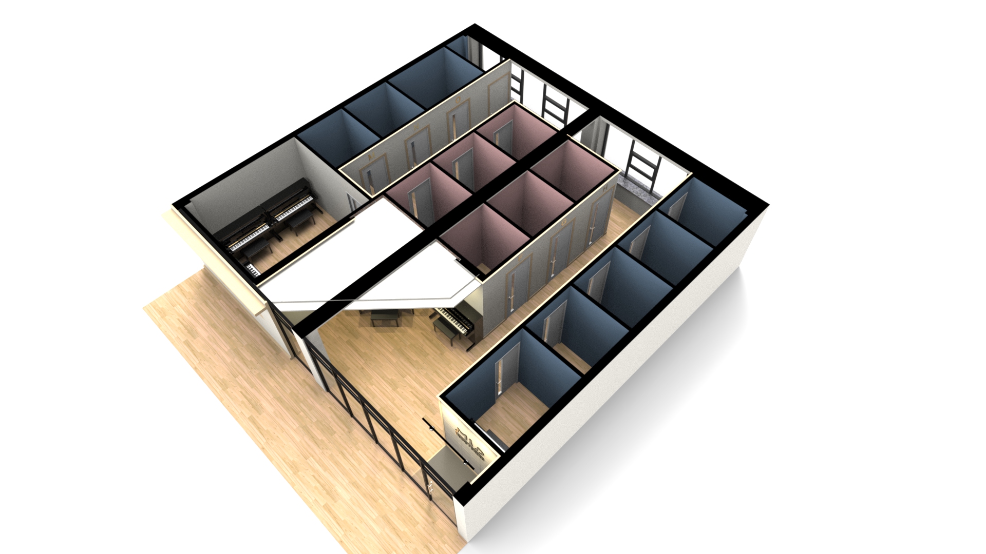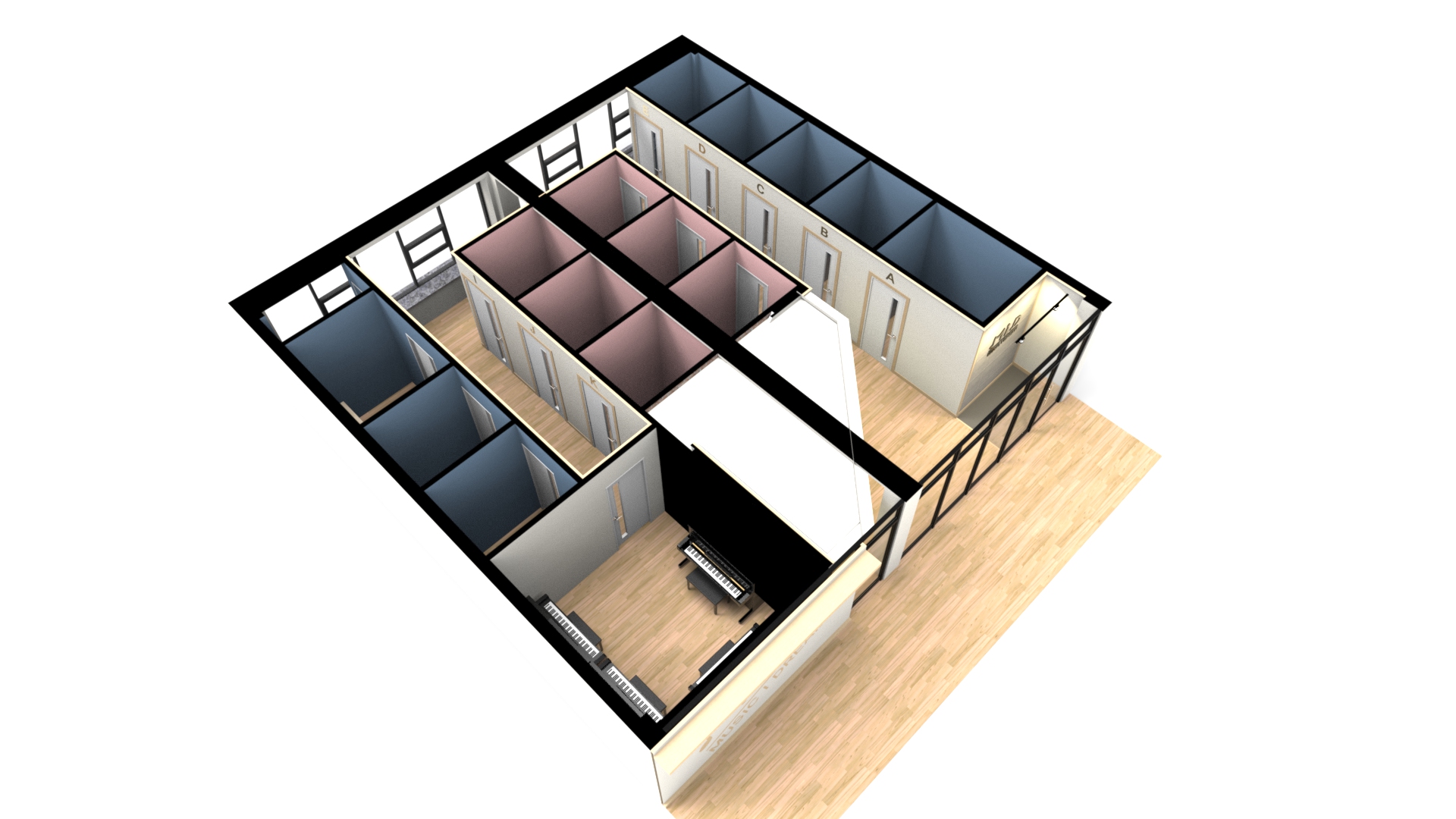 동선은 복도로 계획했고 바닥, 가벽, 문에 방음재를 계획해 소음을 최소화했습니다. 연습실의 배치가 마주보는 형식이기 때문에 가벽은 물론 문의 방음재는 중요한데요, 만약 예산이 그만큼 충분하지 한다면 그에 맞는 배치로 제안드리고 있으니 언제든지 부담없이 문의해 주세요.