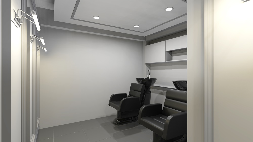 샴푸 공간 이미지입니다. 외부에 직접적으로 노출되지 않도록 손님을 배려해 공간을 계획하고 샴푸 관련된 용품을 수납할 수 있는 수납장을 계획해 직원의 편의성도 높이며 웨인스코팅과 조명 및 블랙컬러의 체어를 계획해 전체적인 인테리어와 통일되게 하는 것이 중요합니다.
