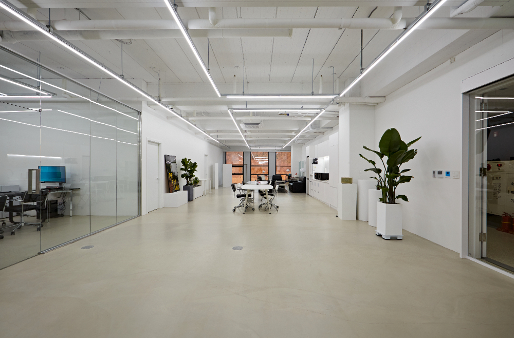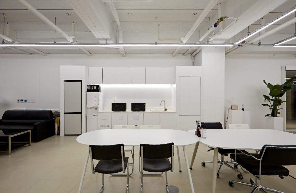 내부에 들어서면 광활한 메인 공간이 눈에 들어옵니다. 이곳은 별도로 로비가 있는것이 아니라 공용 공간이 가장 먼저 펼쳐지는데요. 전반적으로 노출 시공을 통해 천장을 높이면서 라인 조명으로 개방감에 집중하였습니다. 그리고 들어오자마자 보이는 개별공간들은 전부 유리가벽으로 이뤄진 곳이기에 한 눈에 확인할 수 있다는 장점이 있습니다.
