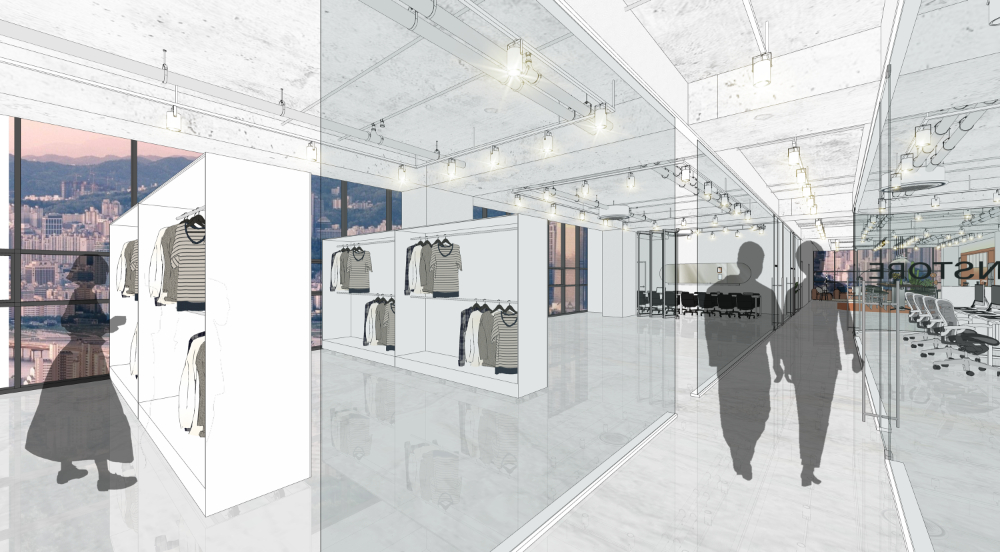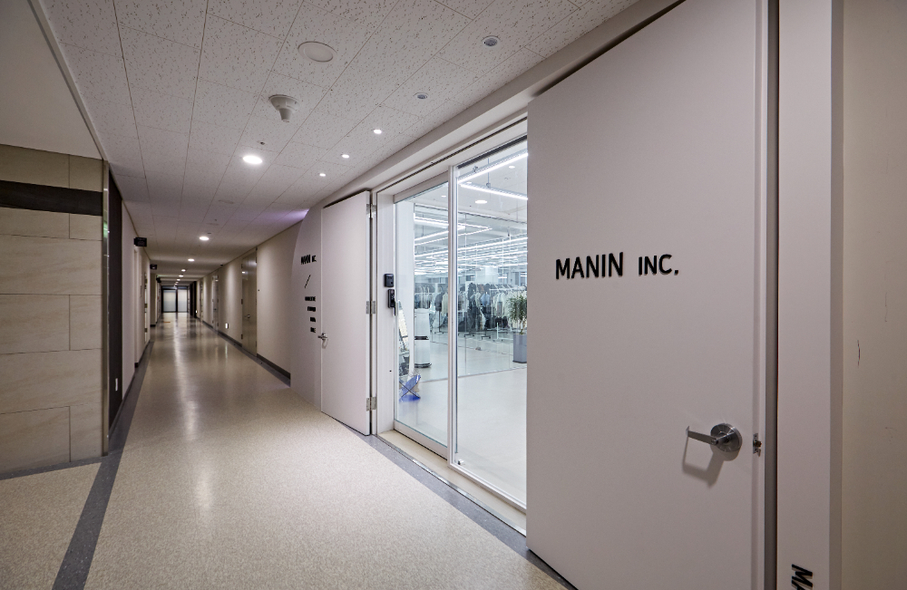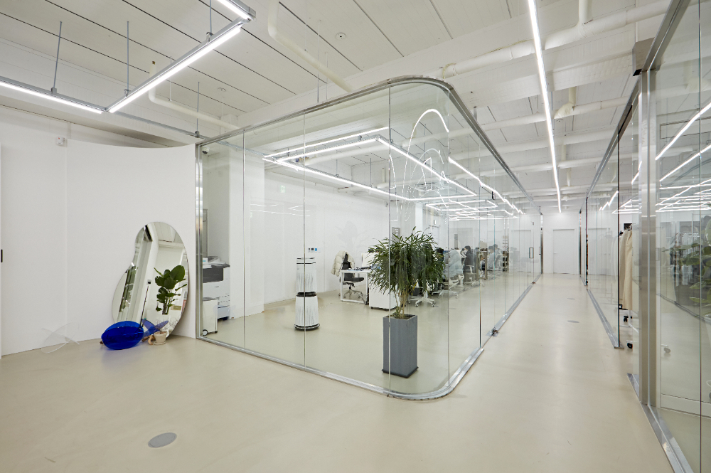 중앙 통로를 기준으로 양쪽으로 사무실들이 비치되어 있는데, 자칫하면 좁아보일 수 있었겠지만 유리로 만들어졌기에 이를 중화시킬 수 있습니다. 그리고 이곳에서는 주요 물품인 옷을 깔끔하게 정리하면서도 업무에 바로바로 활용할 수 있는 공간이 필요했는데요. 이처럼 유리 가벽 공간 안에 있기 때문에 언제든지 필요할 때 바로 적용할 수 있는 시스템을 구축했습니다.