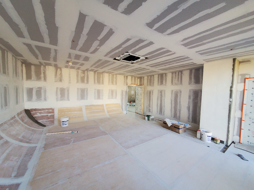 스튜디오로 사용되는 곳은 한쪽면을 곡선으로 마감하기도 하고, 공간마다 다른 차별점이 있었기에 이러한 특수성도 꼼꼼히 반영 하였습니다. 그리고 베테랑 기사님들은 각자 맡은 바에 최선을 다하며 모두가 함께 높은 퀄리티의 완성을 위해 노력했는데요.