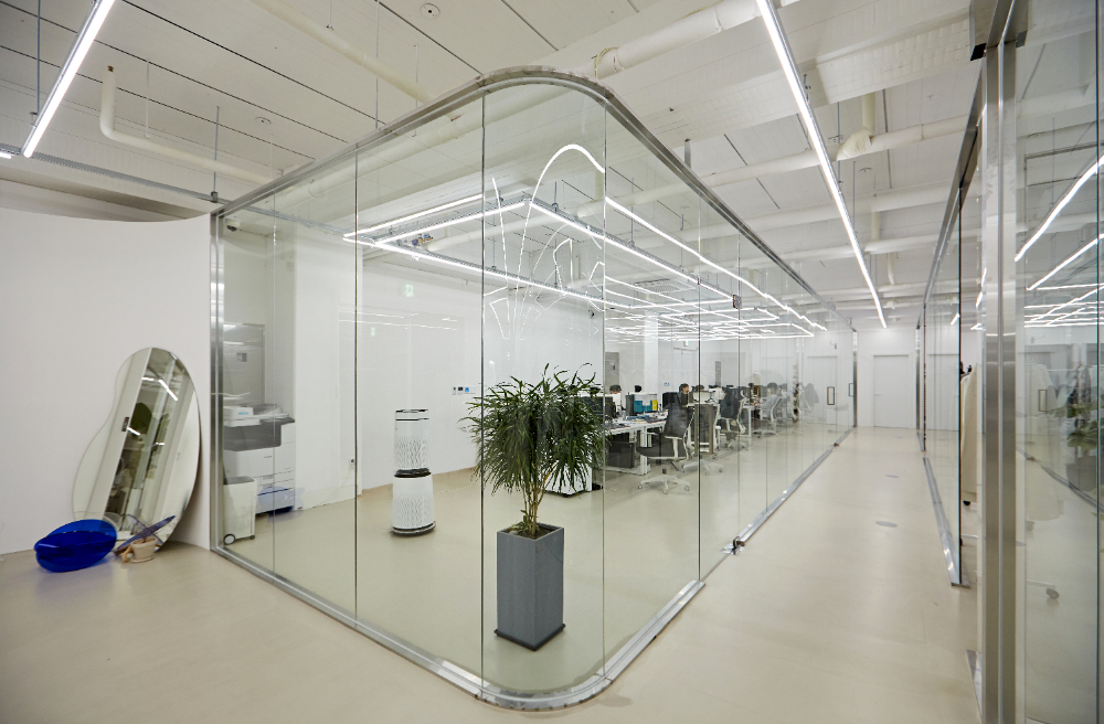 사무실은 지금 보이시는 것 처럼 유리가벽으로 마련된 개별 공간으로 구성되어져 있는데요. 내부가 훤히 보이기 때문에 서로간의 소통이 편하고 통로가 좁게 되어 있지만 좁아보이지 않는 효과를 기대할 수 있습니다.