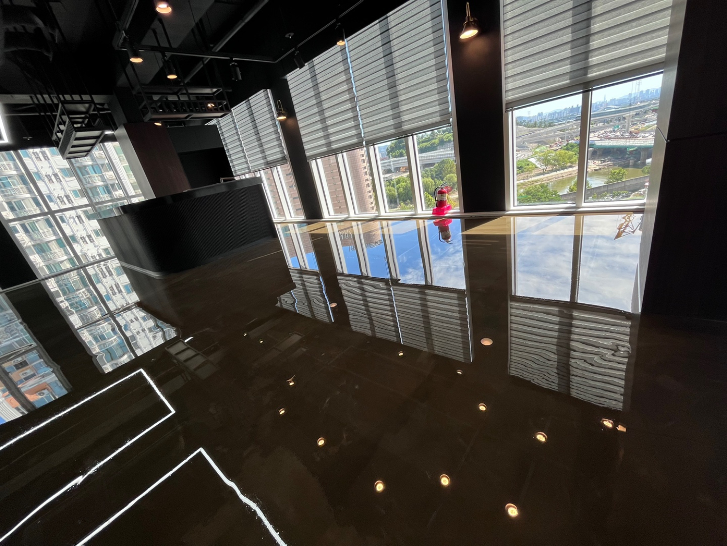 또한 내부로 이어지는 복도가 길어서 웅장함을 보여주기도 하는데요. 위압감을 느낄 수 있는 높은 천고와 유광 시멘트 느낌의 바닥이 조화로움을 이뤄줍니다.
