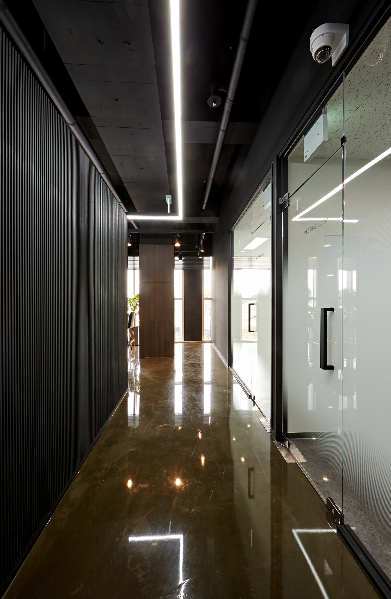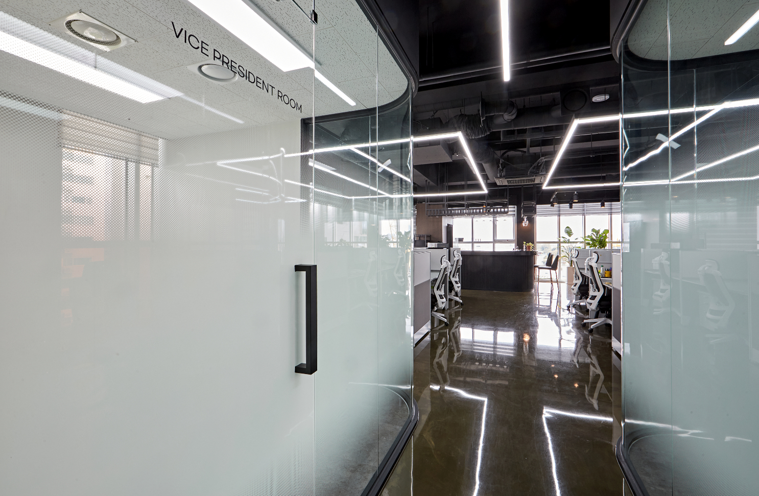 템바보드 파사드는 메인 사무공간과 별도의 룸으로 마련되어 있는 회의실과 같은 공간을 분리하는 역할을 해주고 있습니다. 그리고 천장은 노출 시공하여서 색다른 분위기를 만들면서 대형 라인 조명으로 일반 사무실이 아닌 상업공간 같은 매력을 더해주었습니다.