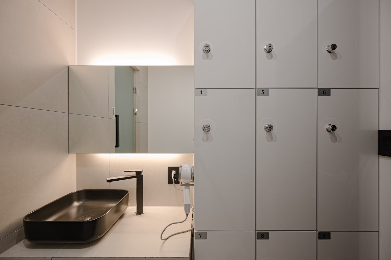 강서구 헬스장 화장실 및 탈의실 시공 완료 모습니다. 입구에는 심플한 디자인의 사인도어를 부착 했습니다.헬스장인테리어에서 빼놓을 수 없는 편의 시설로 전체 컨셉과 통일시켜 화이트로 깔끔하게 마무리 했습니다.
