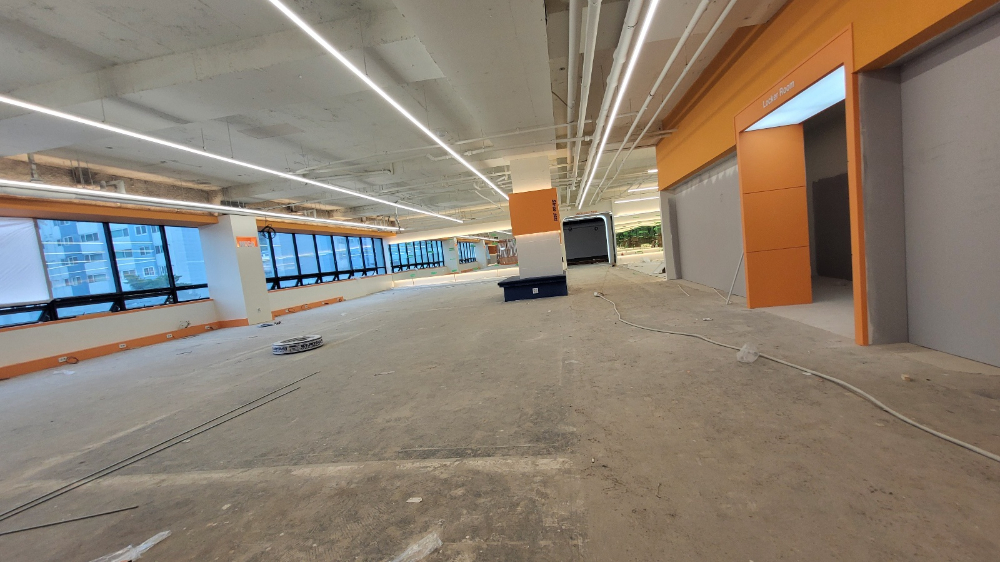 그렇지 않은 곳에는 그레이 컬러로 구분하였고, 천장 테두리에는 전체 오렌지 컬러로 도장하여서 포인트를 주었는데요. 또한, 조명도 전체 라인 조명으로 하여서 비용 절감은 물론 미니멀한 연출을 도왔습니다.