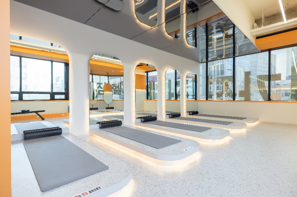 또한 스트레칭존으로 들어가는 곳에는 오렌지색 컬러로 파티션이 설치되어 있는데요. 이렇게 답답하지 않으면서도 공간을 분리할 수 있는 아이디어를 곳곳에 마련하여서 넓은 헬스장인테리어를 효과적으로 만들 수 있게 하였습니다.