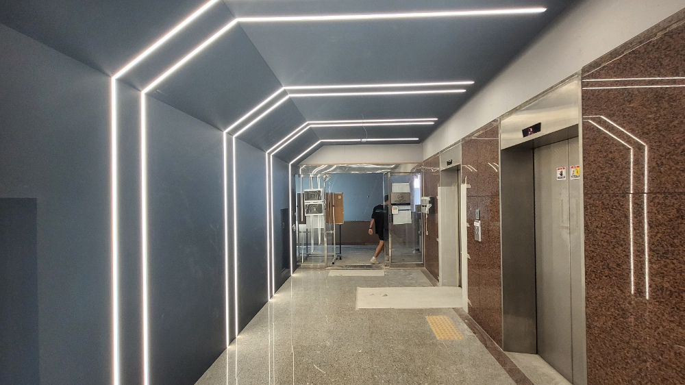 엘리베이터를 타고 내리면 보이는 입구는 현대적인 분위기를 풍기는 곳입니다. 블랙 컬러에 라인 조명이 벽면에서부터 천장으로 이어져있는데요. 이마저도 중간에 각을 주어서 세련됨을 더하였습니다.