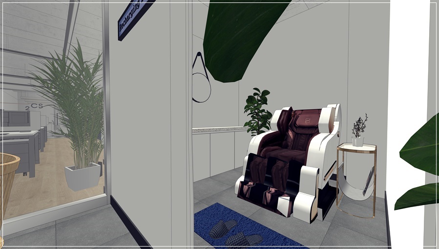 직원의 재충전을 위해 안마의자를 배치해 공동으로 사용할 수 있도록 했고 리차징존이라는 이름에 걸맞게 식물을 활용한 플랜테리어를 적용하면 쾌적한 공간을 유지할 수 있습니다. 강서 마곡 메가타워 사무실인테리어, 오피스 공간분리 3d 디자인으로 인테리어를 미리 확인하고 싶으시다면 저희 916디자인으로 문의해 주세요.