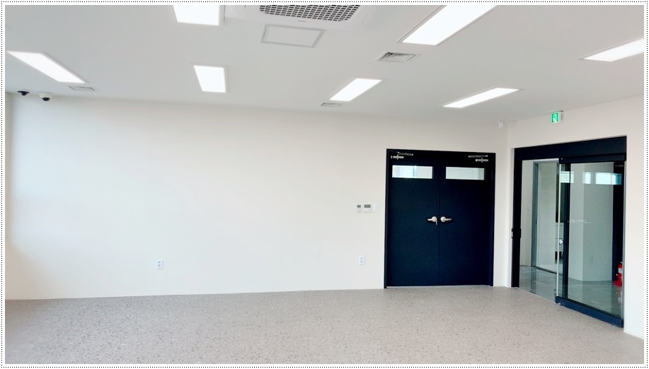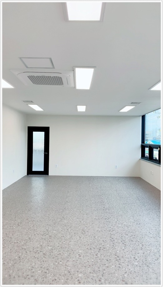 부서가 다른 영역의 사무실입니다. 전체적으로 화이트 & 그레이톤으로 통일성을 유지했고 블랙 컬러를 적용해 영역성을 명확히 했습니다. 목공 가벽으로 공간을 분리하고 복도에서 사무실로 들어오는 문은 유리 자동문을 시공하고 사무실과 사무실을 연결하는 문은 타공 도어를 시공해 차별성을 주었습니다. 전체적으로 매입형 조명을 시공해 깔끔하고 높은 층고를 유지하도록 했고 창문으로 들어오는 자연채광을 충분히 활용해 밝고 쾌적한 환경을 유지하도록 했죠.