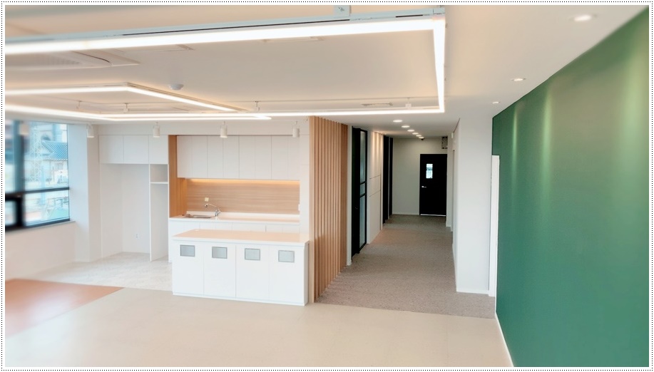 일반 사무실과 다르게 라인 조명을 스퀘어형으로 디자인 시공해 차별성을 두면서 충분한 조도를 확보했고 따뜻한 전구색을 적용해 아늑한 공간이 되도록 했습니다. 상부장과 하부장 사이에 간접조명을 시공하고 아일랜드 상부에 레일형 조명을 시공해 좀 더 밝게 사용할 수 있도록 했으며 간형 가벽으로 공간을 분리했습니다.