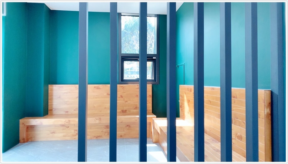공용 로비에 구성한 휴게공간입니다. 간살 파티션을 시공해 공간을 만들었고 목공 가벽 대신 간살을 적용해 개방감을 주면서 시선을 분산시킬 수 있도록 했습니다. 엘리베이터에 적용한 템바보드의 블루 컬러를 휴게공간에도 적용해 통일성을 주었고 같은 공간으로 인지할 수 있도록 했는데요, 내부에도 함께 적용해 깔끔하게 연출했습니다. 벽면을 시원한 블루 컬러로 마감하고 우드톤 벤치를 벽면에 시공해 내추럴하고 편안한 분위기에서 쉴 수 있도록 했습니다.