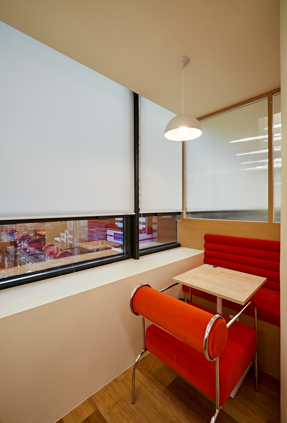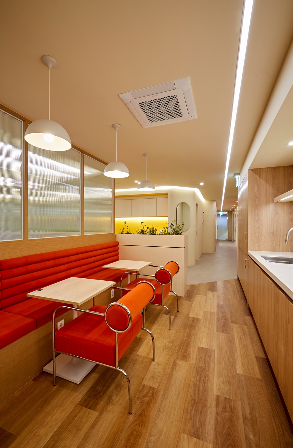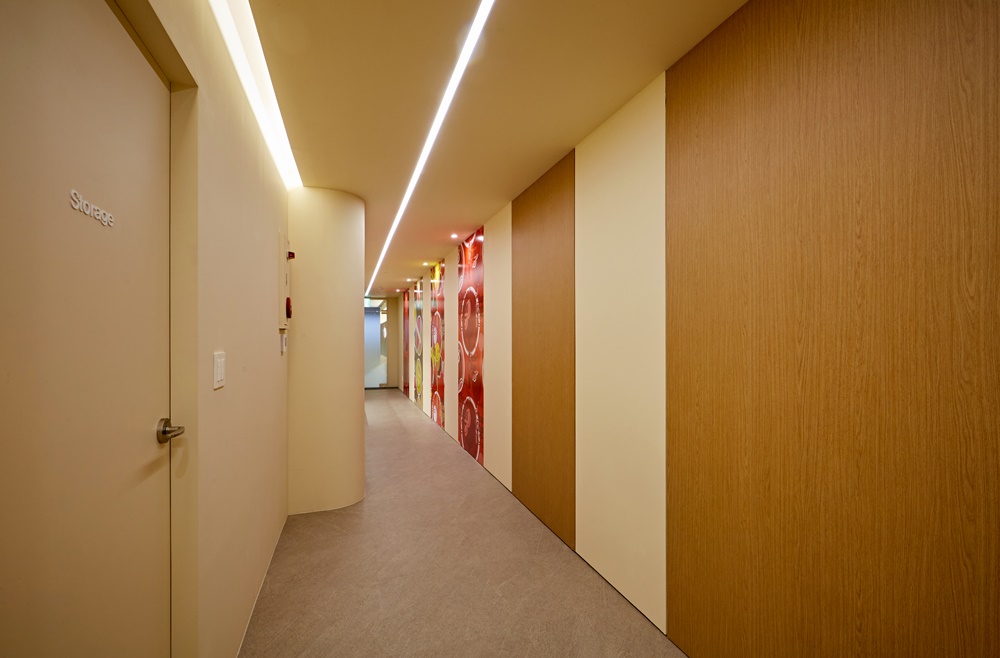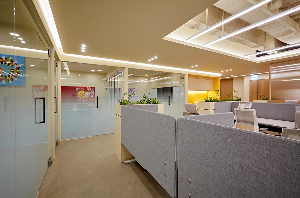 기업의 브랜드 아이덴티티와 맞닿아 있는 톡톡 튀는 컬러는 사무실 내외부 모두에 긍정적인 이미지를 전달하게 만들어요.